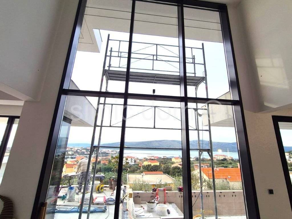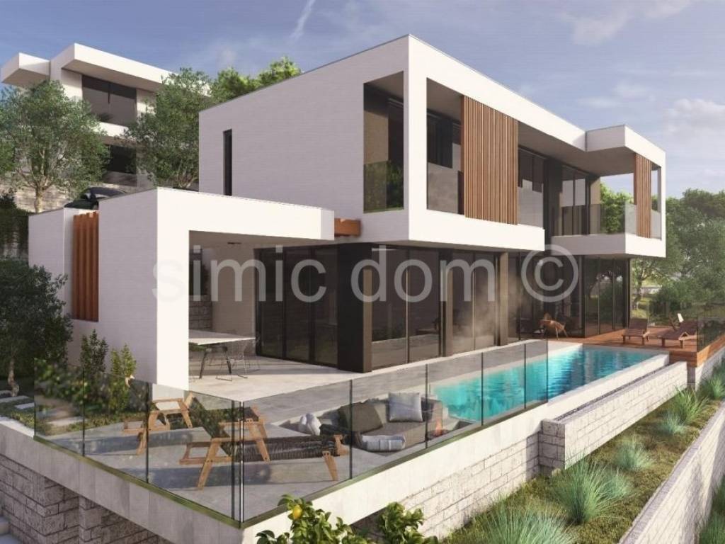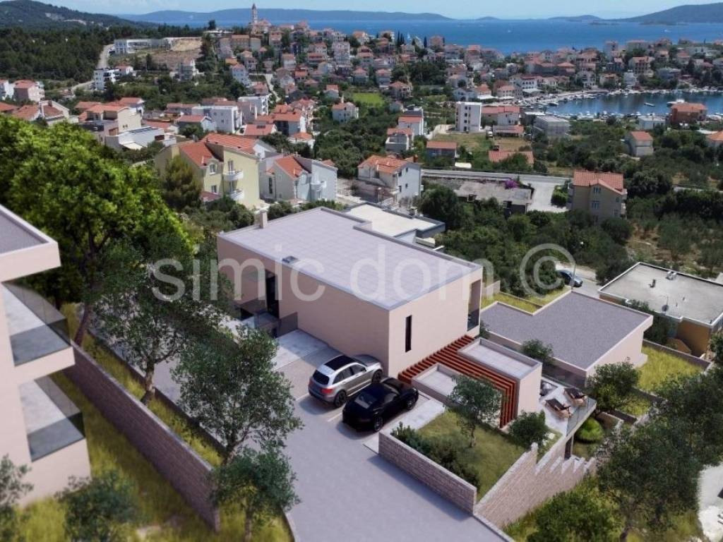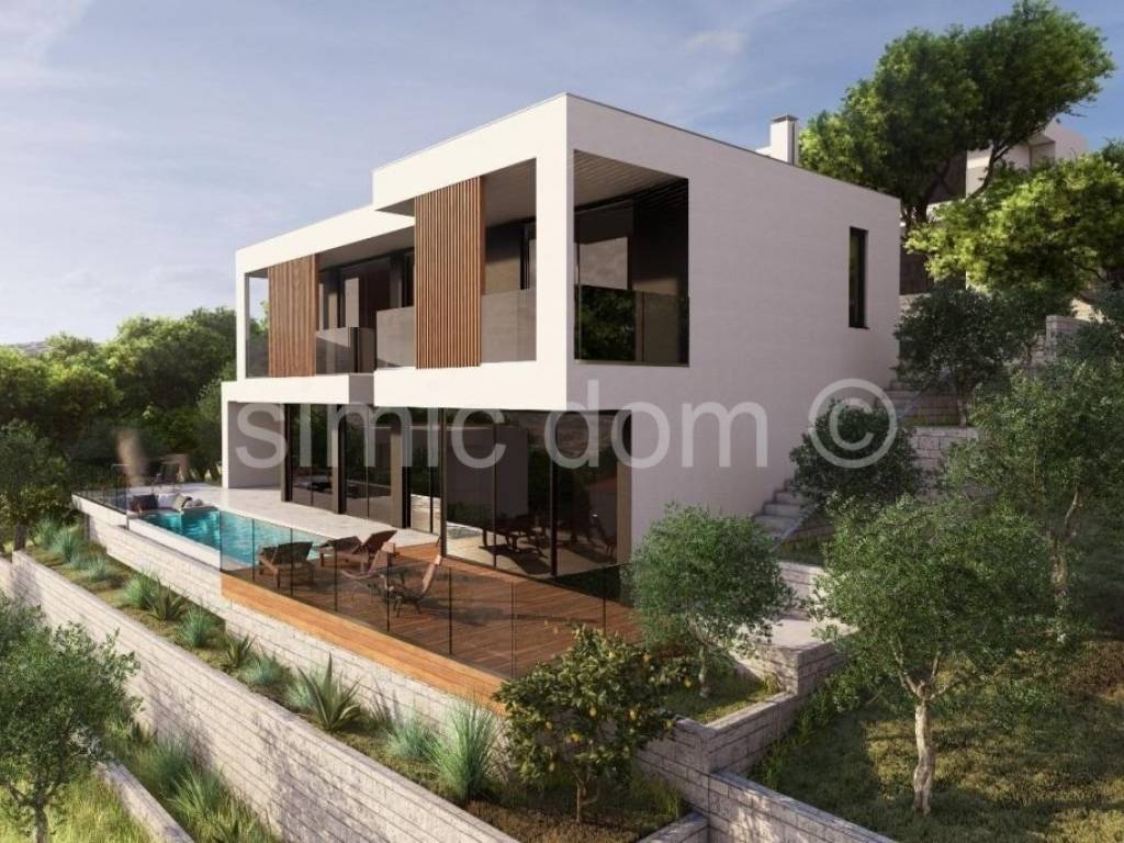 For sale is a beautiful villa with a swimming pool located in a quiet place near Trogir, Seget Vranjica. The villa is located on an elevated location with a spectacular panoramic view of the sea and islands, and it is only 400m from the sea. This exclusive project has been elaborated in detail to satisfy even the most demanding customers. The villa is in the completion phase and is being sold fully furnished and equipped. The villa is located on a plot of land of 530 m2 and has a net area of 250 m2 spread over two floors. On the lower floor there is a living room with a kitchen and dining room, a bedroom, a bathroom, a guest toilet and a storage room. On the upper floor, there are three more bedrooms, each with its own bathroom and dressing room, and a large additional gallery, designed as a space for socializing. The villa was built according to the highest standards, it is of reinforced concrete construction, the rooms are equipped with underfloor heating and air conditioning, the exterior carpentry is aluminum in anthracite color, there is also video surveillance, video intercom, blind doors, etc. Beautiful garden landscaped with Mediterranean plants it has an overflow pool of 30 m2, a beautifully decorated area for dinners with a barbecue and a sun deck. There are three parking spaces on the lot.
