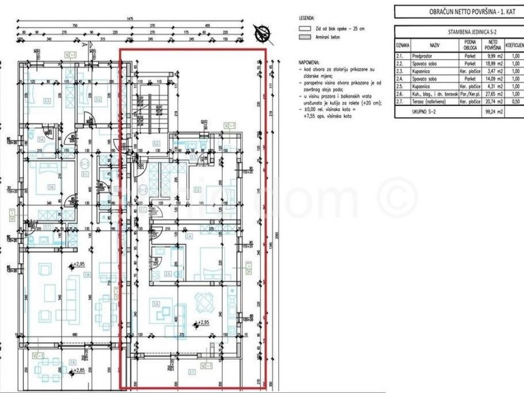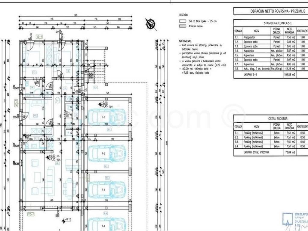 For sale are apartments located in a smaller residential building with 4 comfortable apartments with garages. The building is situated only 270m from a beautiful pebble beach in Srima, and the center of neighboring Vodice is only 1.5km away. The apartment on the ground floor (S1) has a total net area of 131m2, i.e. an internal area of 104.88m2. The apartment consists of three bedrooms (two with private bathrooms), an additional bathroom, an entrance hall and a spacious kitchen with dining room and living room with access to the terrace. The property also includes a landscaped yard of 130m2. It is possible to obtain a garage of 17.51m2 for a surcharge. The price of apartment S1 is 354,000. The apartment on the first floor (S2) has a total net area of 102m2, of which 78.50m2 is internal space and 20.74m2 is the floor area of its terrace. It consists of two bedrooms, two bathrooms, an entrance hall and a spacious kitchen with a dining room and a living room with access to a covered terrace. It is possible to obtain a garage of 17.51m2 for a surcharge. The price of the apartment (S2) is 339,660. All apartments in the building will be equipped with high-quality ceramics, windows and doors with electric blinds and mosquito nets, burglar-proof entrance doors, underfloor heating in the bathrooms. Furthermore, every room and living room will have air conditioning and TV connection, as well as modern sanitary facilities. The planned move-in date is mid-summer 2024.