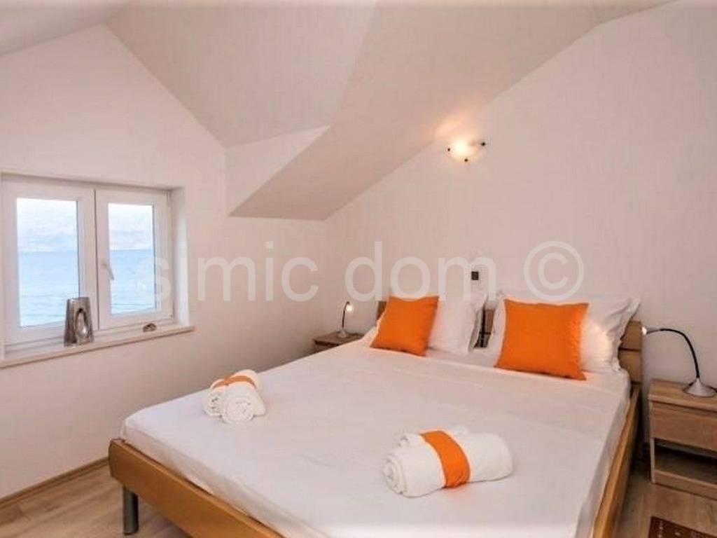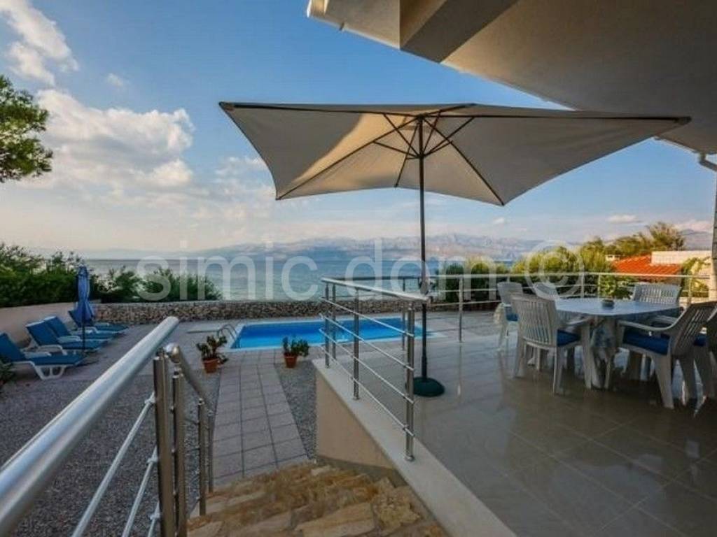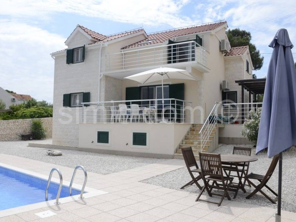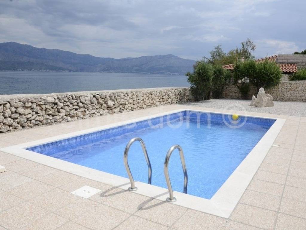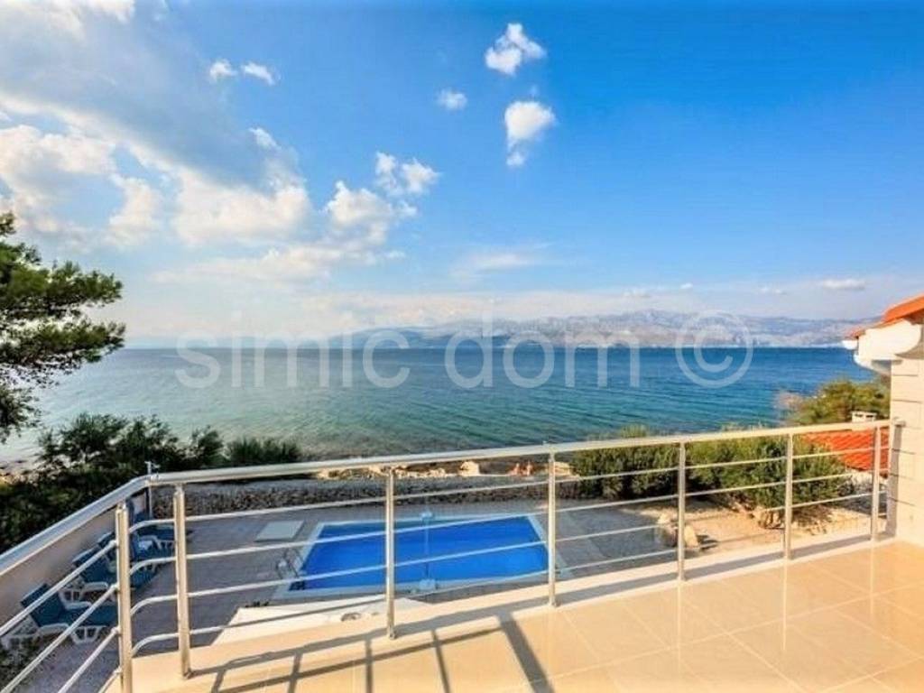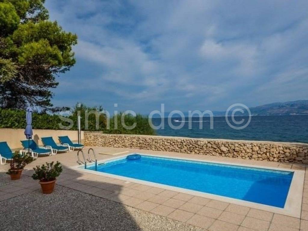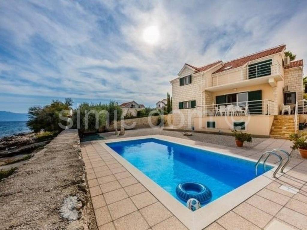 Villa in the first row to the sea, on the island of Brac A beautiful villa is for sale, located in the first row to the sea, in a quiet environment where the beach stretches between the house and the sea, and this area is accessible only to pedestrians. The villa was built on a plot of 605 sqm, and its surface is 197 sqm. The house consists of a ground floor and the first floor, which are residential (a total of 183 sqm), and there is also a basement (storage) area of 14 sqm. On the south side of the ground floor there is a spacious covered terrace ideal for enjoying the deep shade. The interior part of the ground floor consists of an entrance hall, a kitchen, a dining room, a living room, a bathroom and a bedroom. The living room opens onto a spacious terrace offering a wonderful view of the sea. An internal staircase leads to the first floor where there are three bedrooms, two bathrooms and a terrace. The house is air-conditioned, and the living room and kitchen on the ground floor have underfloor heating, so the villa is ideal for a year-round stay. The property is being sold furnished and equipped. The exterior is landscaped and cultivated. In the yard there is a barbecue, a swimming pool and parking spaces for four cars. Ownership in order.