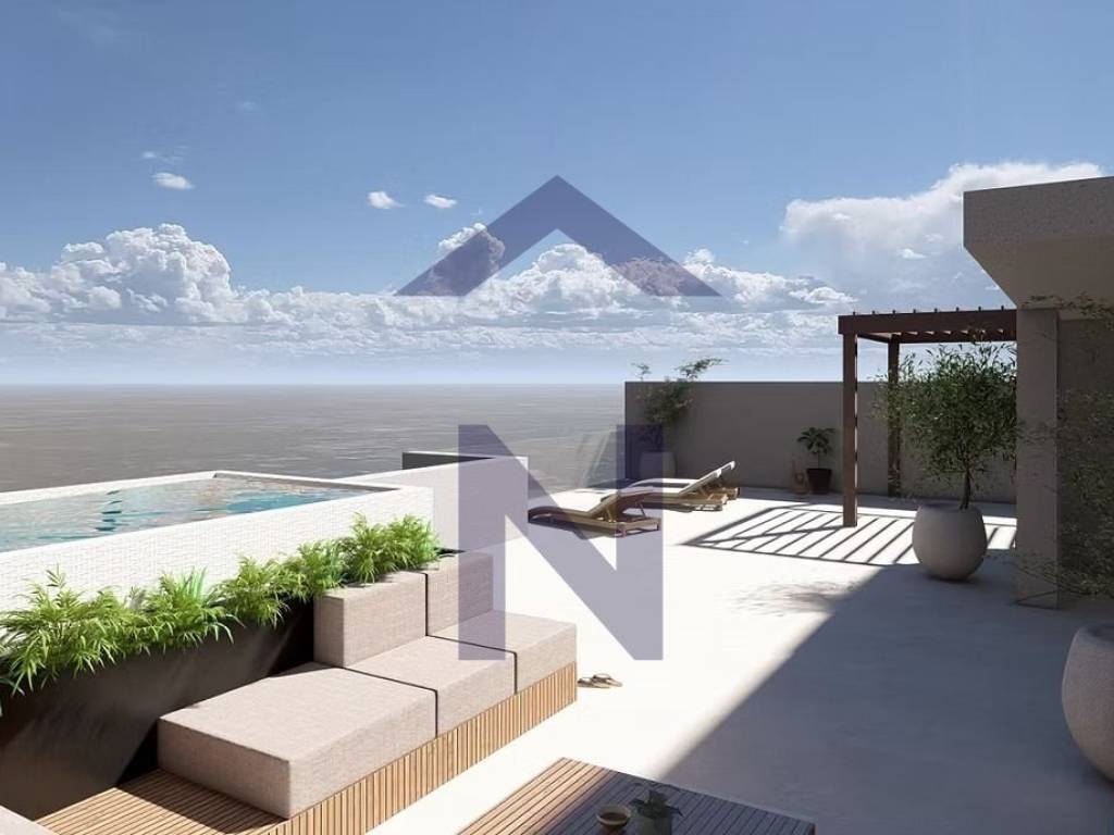 The ground floor apartment includes a large garden, private pool, and outdoor shower. Loggias on the first floor have pre-installation for a jacuzzi, and the second-floor unit includes a rooftop terrace with the option of additional features such as an infinity pool, shower, summer kitchen, and bioclimatic pergola.