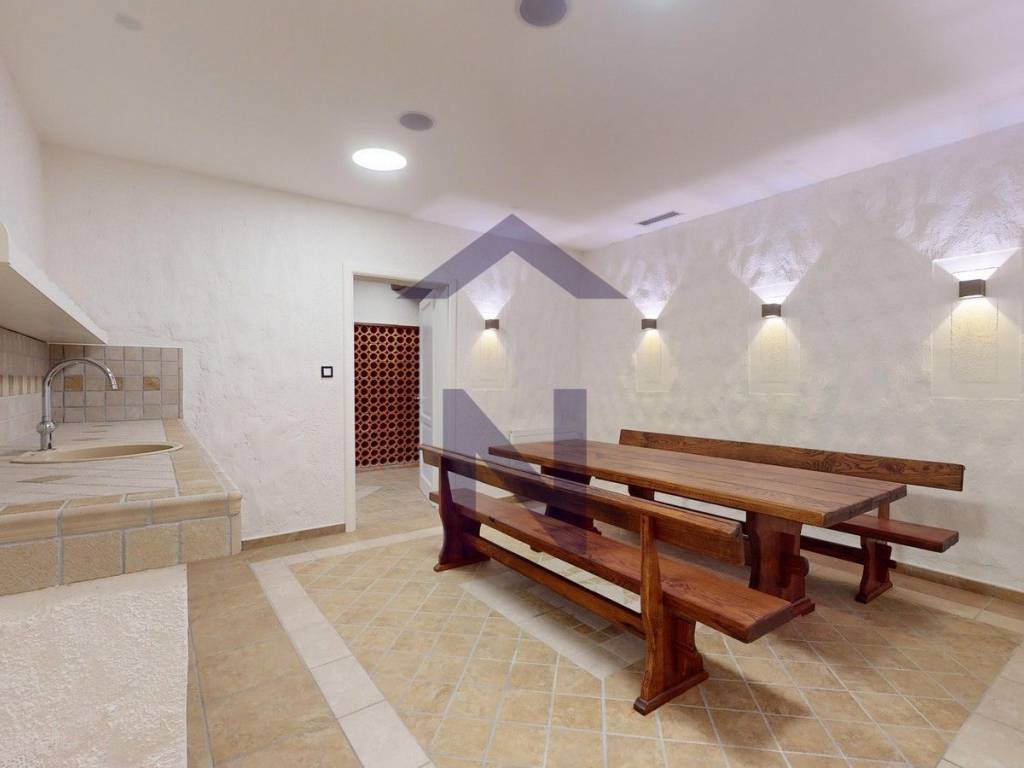Podrum:garaža za dva automobila, praonica rublja, prostor za smještaj tehnike, izba, kotlovnica, wc, prostor za druženje s vinskim podrumom, wellness sa saunom, tušem i jaccuzijem, fitness/teretana, prostorija za bazensku tehniku, spremište za vrtni alat i hodnik.