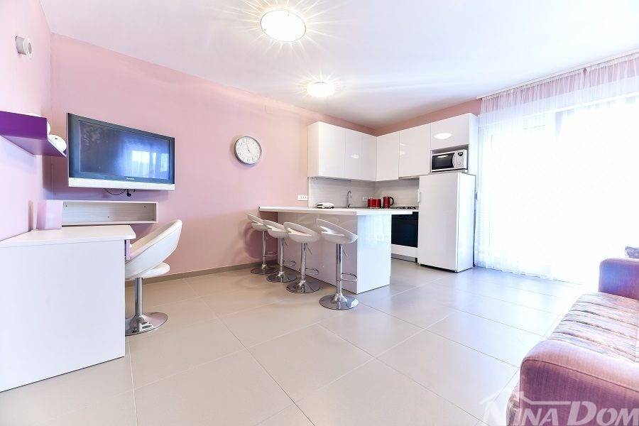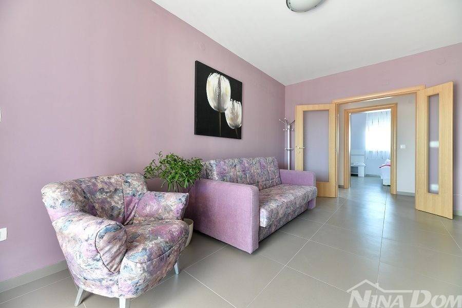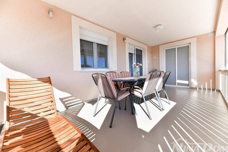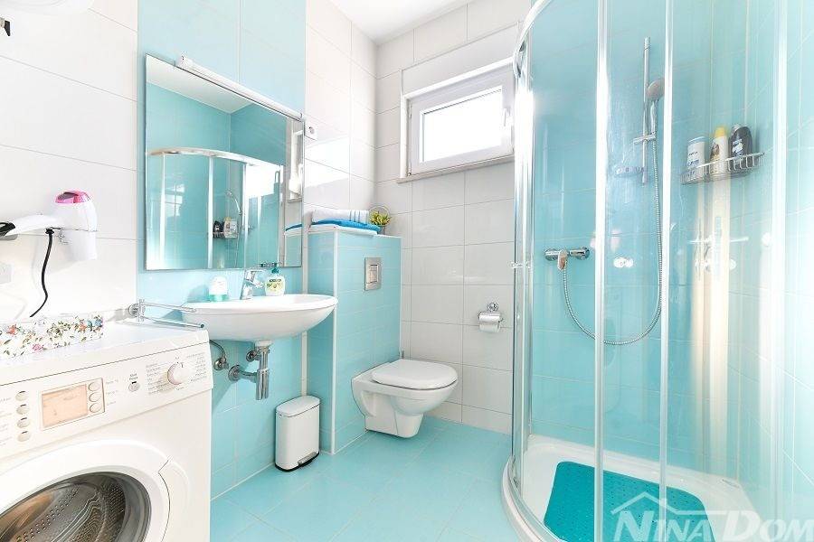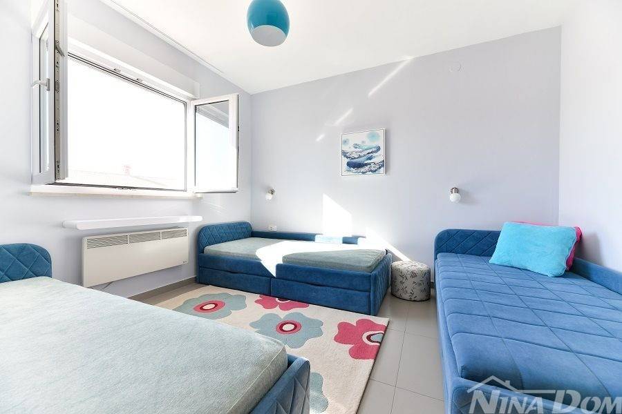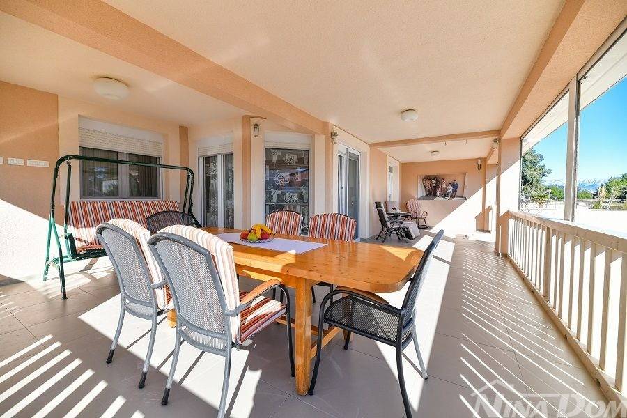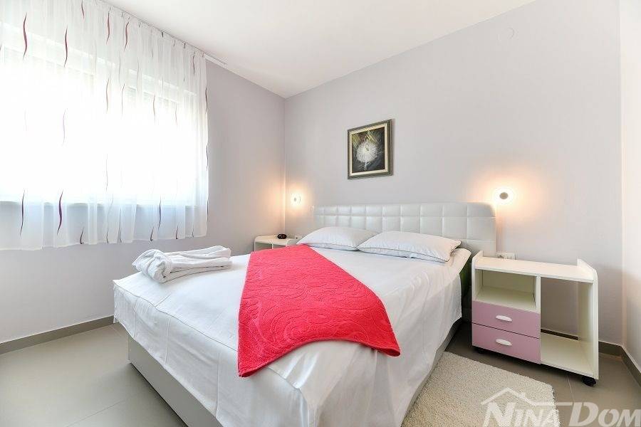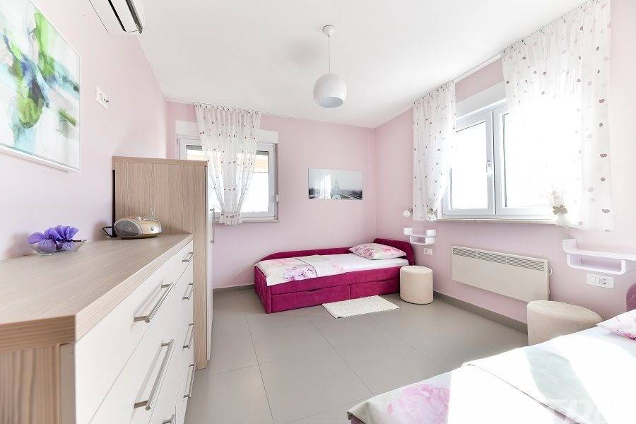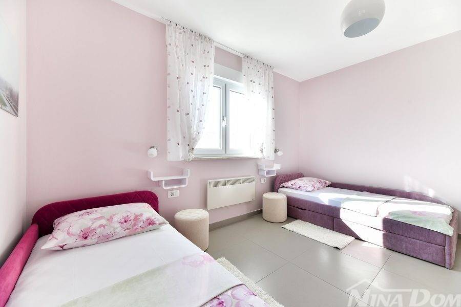 Prizemlje: velika natkrivena terasa, kuhinja s dnevnim boravkom i blagovaonicom, kupaona, garderoba, dvije spavaće sobe od kojih jedna ima svoju kupaonicu.