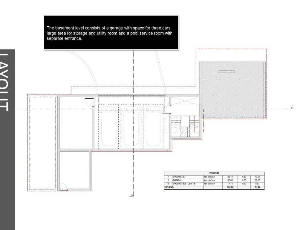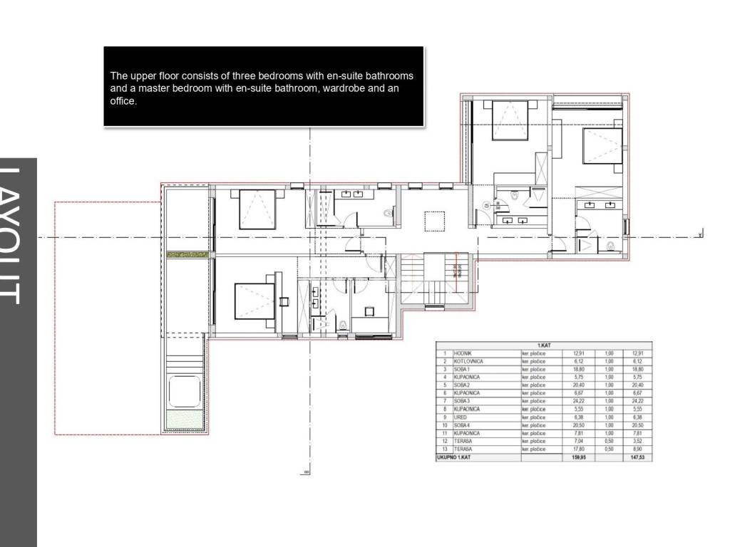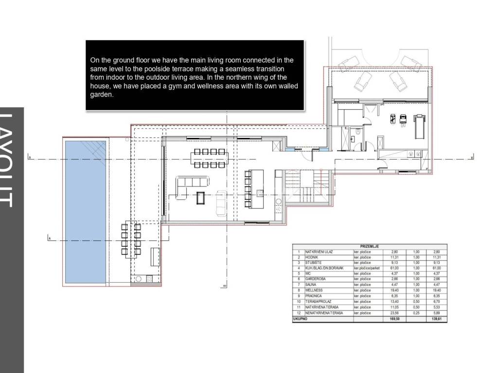 Ova luksuzna vila prostire se na tri etaže, smještena je u mirnom predjelu Zadra 500m od mora.Na 1.katu kuće nalaze se četri spavaće sobe sa kupaonicama,ured,kotlovnica i dvije terase.Prizemlje kuće sastoji se od prostranog dnevnog boravka,blagavaonice, kuhinje,wc, sauna,wellnes,praonica,terasa i bazen.U suterenu kuće nalazi se garaža za tri automobila,spremište i strojarnica za bazen.Ova villa opremljena je HVAC sistemom koji je povezan sa vrhunskom toplinskom Altherma pumpom u kombinaciji sa solarnim panelima, za kompletno grijanje i hlađenje cijele kuće, punjačima za električni automobil, pročišćavaćom vode......