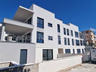 Čiovo, Okrug Gornji, penthouse 85 m2 + 40 m2 roof terrace + 25 m2 rooftop pool, in a new building with an elevator and a garage with an open sea view, only 130 m from the sea and the beach. The apartment is located on the 2nd floor (last) and is north-south-west oriented and consists of two bedrooms, two bathrooms, a kitchen with a dining room and a living room, and a large balcony (25 m2) with a sea view and a large roof terrace (65m2) with a swimming pool with a machine room, and has the possibility of setting up a barbecue and a summer kitchen. The apartment also has one garage parking space and it is possible to buy an additional one for an additional fee. The apartment is located in a new building that is in the final stages of construction and will soon be ready for occupancy. Quality construction and equipment of the apartment (quality ceramics, underfloor heating throughout the apartment, electric shutters, air conditioning units in each room, large glass wall in the living room, large terrace, glass fence, swimming pool, etc.). Excellent and quiet location on the south side of the island of Čiovo, close to the sea and beach and panoramic and open sea views from the apartment and terrace.For more info contact the agency.