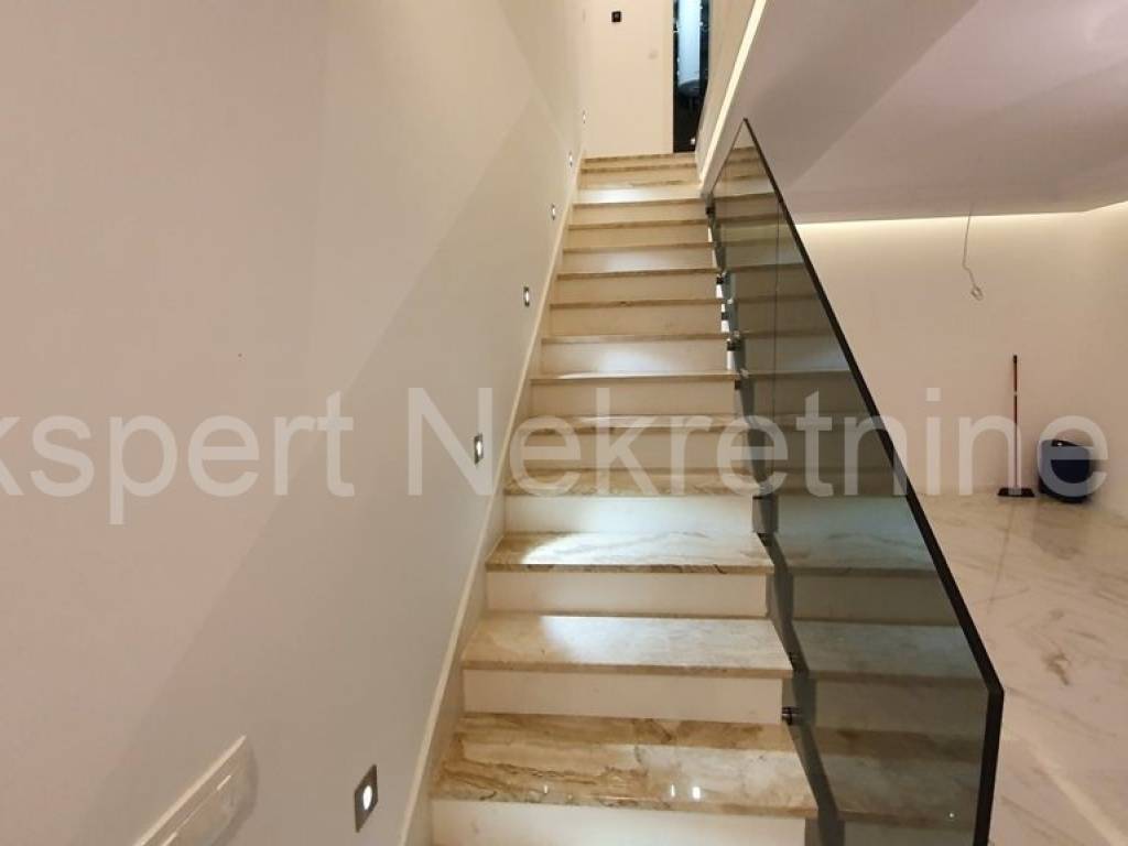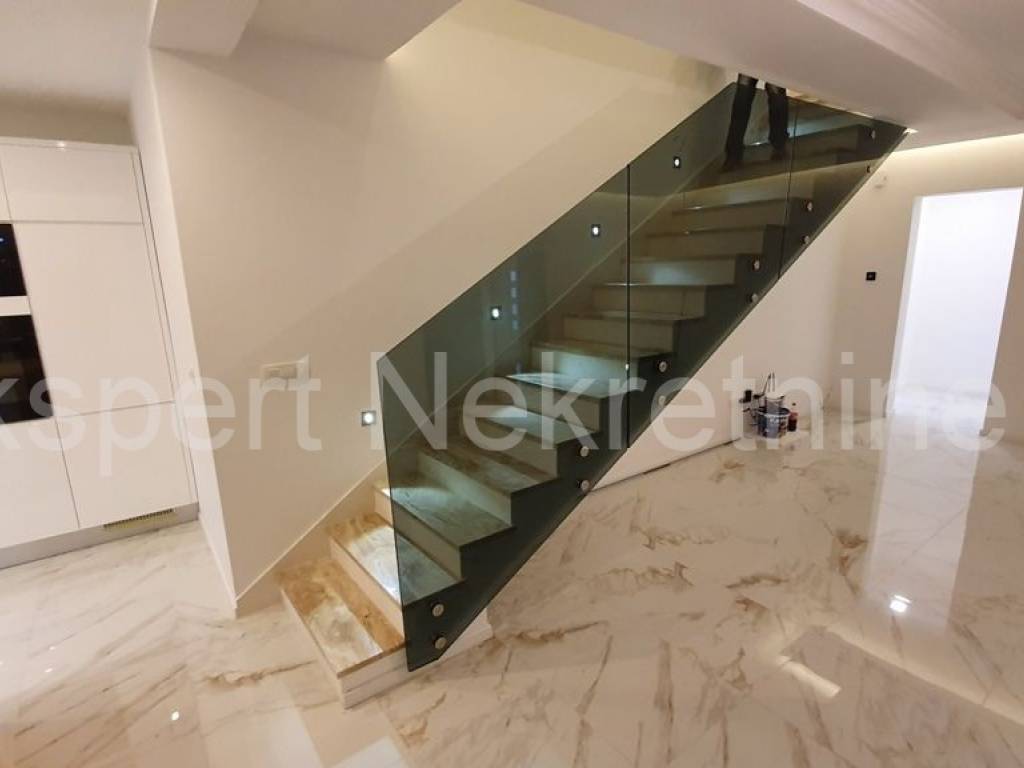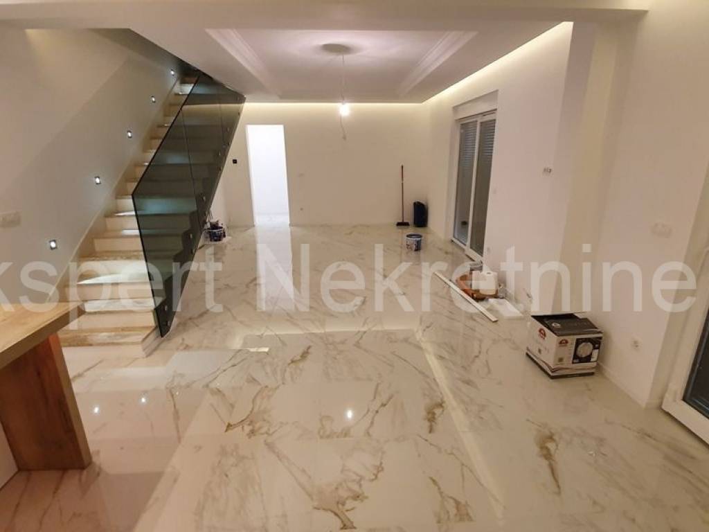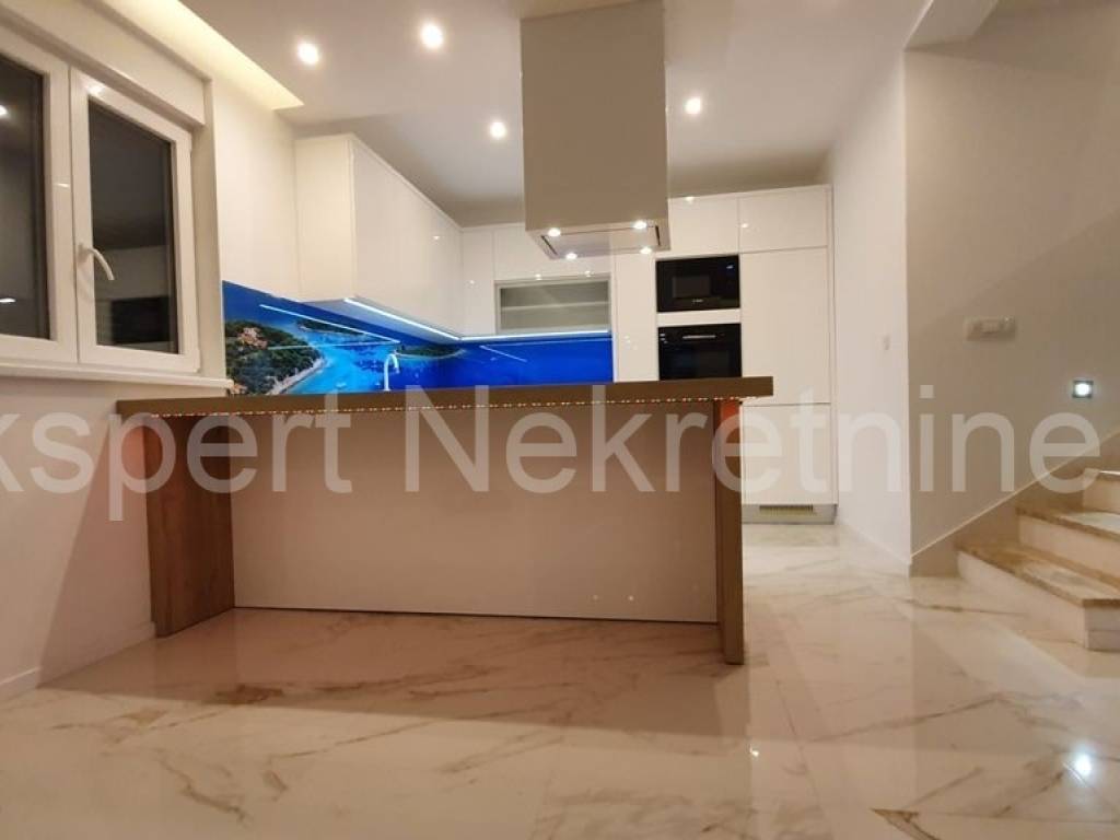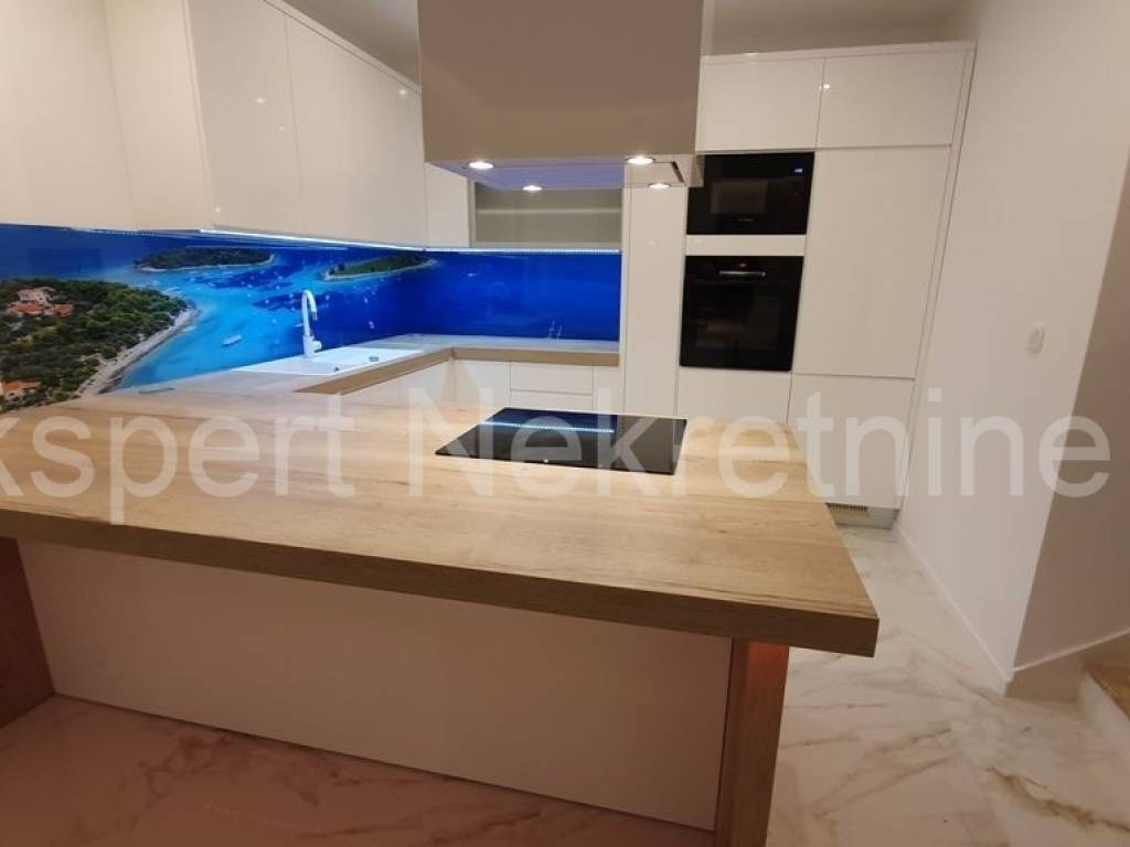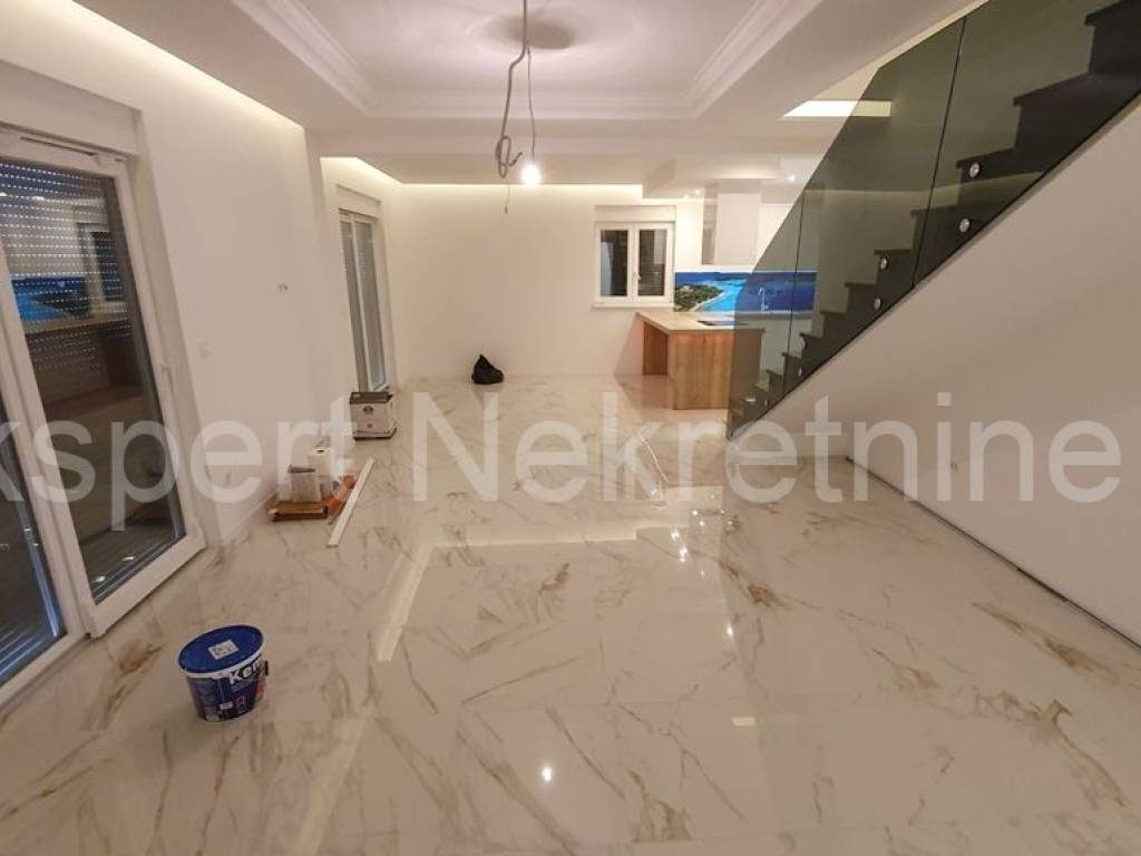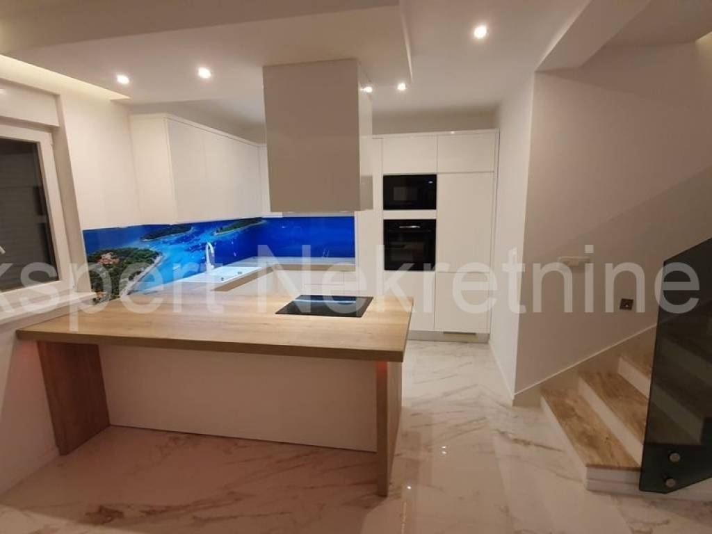 Trogir,luksuzan dvoetažan 2-soban stan 114 m2 s vrtom 100 m2, novogradnja,u zgradi sa samo dva stana.Na prizemlju zgrade se nalazi kupatilo,hodnik,velika kuhinja(sa novoopremljenom kuhinjom) sa blagovaonicom i veliki dnevni boravak iz kojeg ima izlaz u veliki vrt (100 m2) te unutarnje stepenište kojim se penje na drugu etažu na kojoj se nalaze dvije spavaće sobe od kojih jedna sa velikim vlastitim kupatilom i lođom sa koje ima pogled na more i grad,još jedno kupatilo,te praonica sa strojarnicom za solare i centralnim bojlerom .Stan je opremljen vrlo kvalitetnim materijalima i opremom,(stolarija s tri stakla i daljinskim podizanjem roleta,stepenište od kvalitetnog kamena,staklena ograda stubišta i lođe,cijeli stan je opremljen led trakama i led rasvjetom,knaufom dizajniran plafon,kvalitetna keramika itd..).Stan se prodaje sa novim namještajem.Stanu pripadaju i dva vanjska parking mjesta te ograđeni vrt površine 100 m2.Stan ima zaseban ulaz te je spojen na gradsku kanalizaciju.Odmah useljiv.