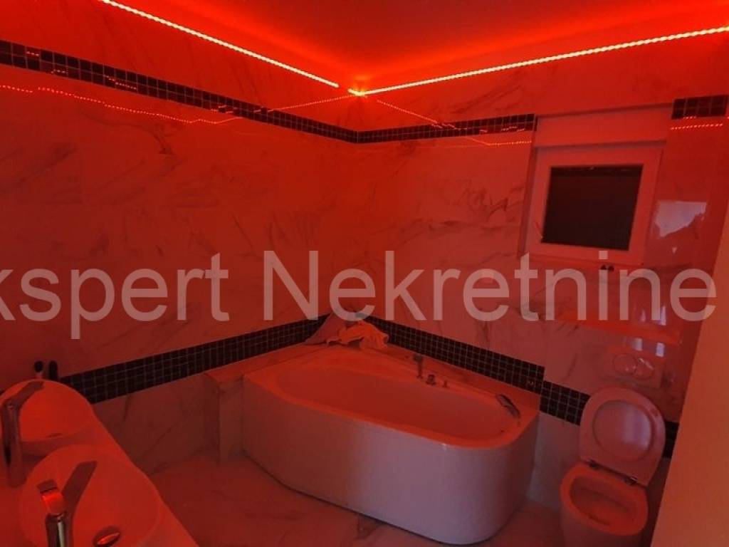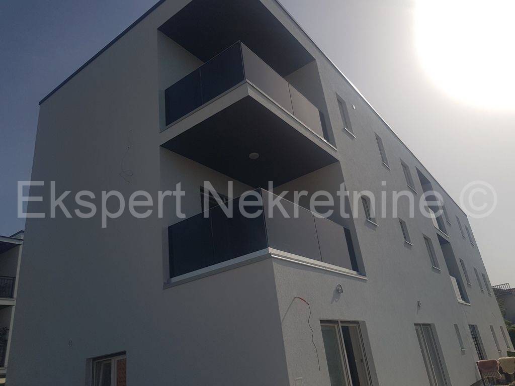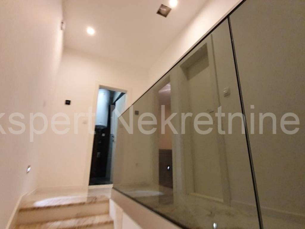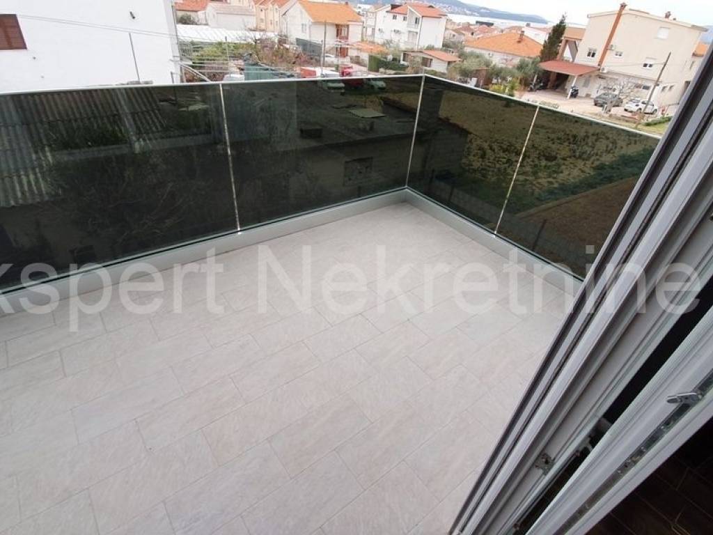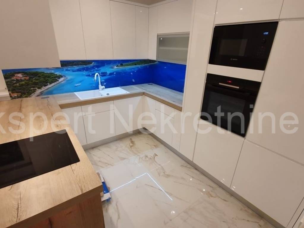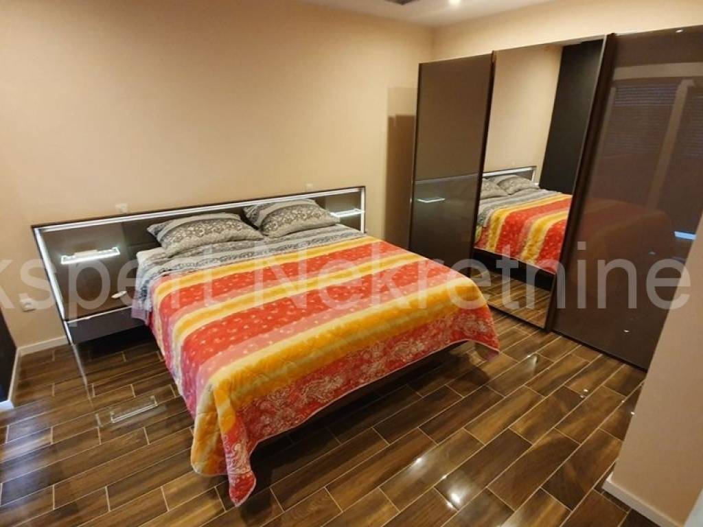 Trogir,luksuzan dvoetažan 2-soban stan 114 m2 s vrtom 100 m2, novogradnja,u zgradi sa samo dva stana.Na prizemlju zgrade se nalazi kupatilo,hodnik,velika kuhinja(sa novoopremljenom kuhinjom) sa blagovaonicom i veliki dnevni boravak iz kojeg ima izlaz u veliki vrt (100 m2) te unutarnje stepenište kojim se penje na drugu etažu na kojoj se nalaze dvije spavaće sobe od kojih jedna sa velikim vlastitim kupatilom i lođom sa koje ima pogled na more i grad,još jedno kupatilo,te praonica sa strojarnicom za solare i centralnim bojlerom .Stan je opremljen vrlo kvalitetnim materijalima i opremom,(stolarija s tri stakla i daljinskim podizanjem roleta,stepenište od kvalitetnog kamena,staklena ograda stubišta i lođe,cijeli stan je opremljen led trakama i led rasvjetom,knaufom dizajniran plafon,kvalitetna keramika itd..).Stan se prodaje sa novim namještajem.Stanu pripadaju i dva vanjska parking mjesta te ograđeni vrt površine 100 m2.Stan ima zaseban ulaz te je spojen na gradsku kanalizaciju.Odmah useljiv.