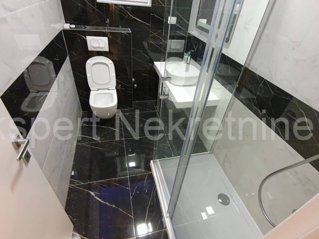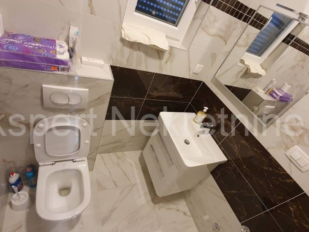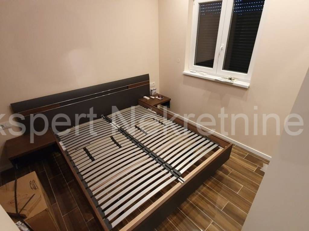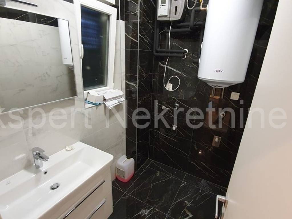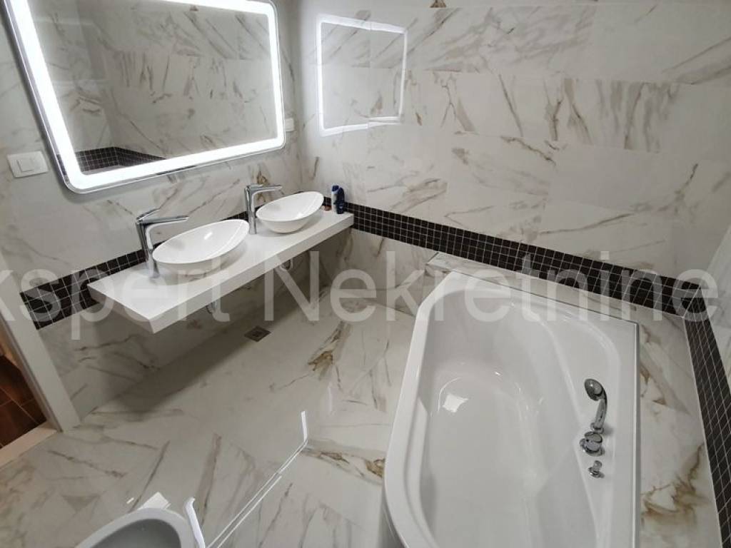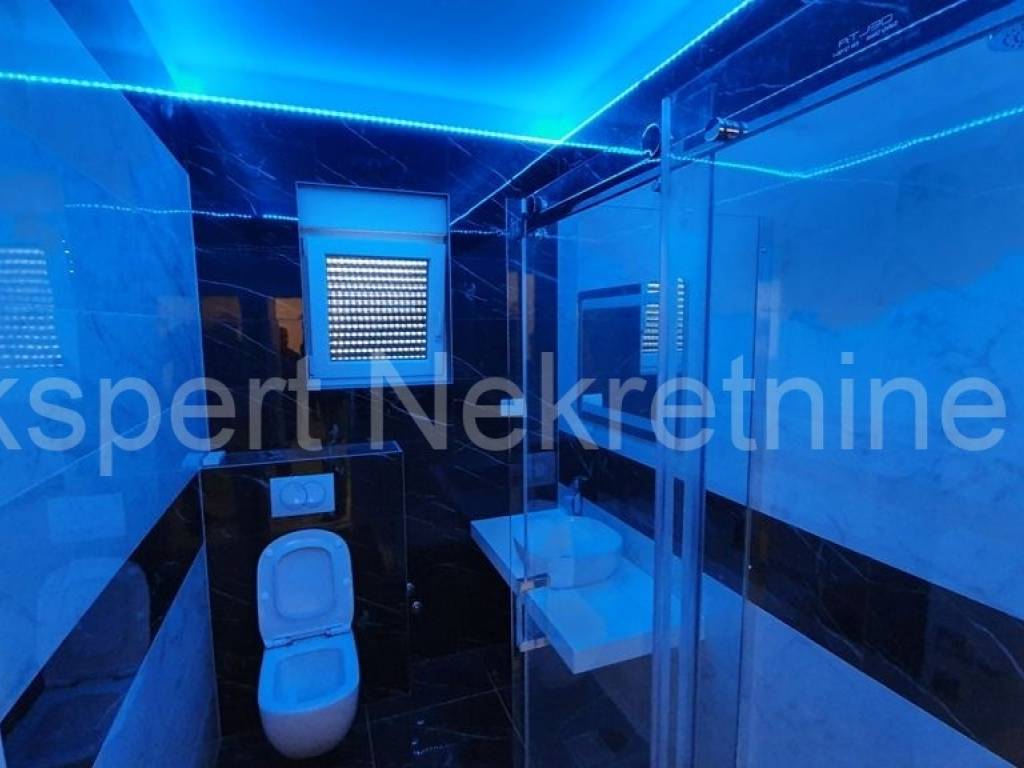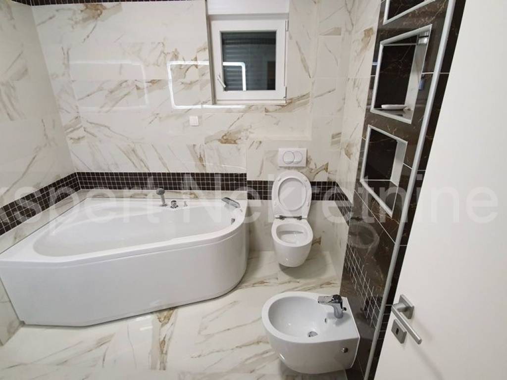 Trogir,luksuzan dvoetažan 2-soban stan 114 m2 s vrtom 100 m2, novogradnja,u zgradi sa samo dva stana.Na prizemlju zgrade se nalazi kupatilo,hodnik,velika kuhinja(sa novoopremljenom kuhinjom) sa blagovaonicom i veliki dnevni boravak iz kojeg ima izlaz u veliki vrt (100 m2) te unutarnje stepenište kojim se penje na drugu etažu na kojoj se nalaze dvije spavaće sobe od kojih jedna sa velikim vlastitim kupatilom i lođom sa koje ima pogled na more i grad,još jedno kupatilo,te praonica sa strojarnicom za solare i centralnim bojlerom .Stan je opremljen vrlo kvalitetnim materijalima i opremom,(stolarija s tri stakla i daljinskim podizanjem roleta,stepenište od kvalitetnog kamena,staklena ograda stubišta i lođe,cijeli stan je opremljen led trakama i led rasvjetom,knaufom dizajniran plafon,kvalitetna keramika itd..).Stan se prodaje sa novim namještajem.Stanu pripadaju i dva vanjska parking mjesta te ograđeni vrt površine 100 m2.Stan ima zaseban ulaz te je spojen na gradsku kanalizaciju.Odmah useljiv.