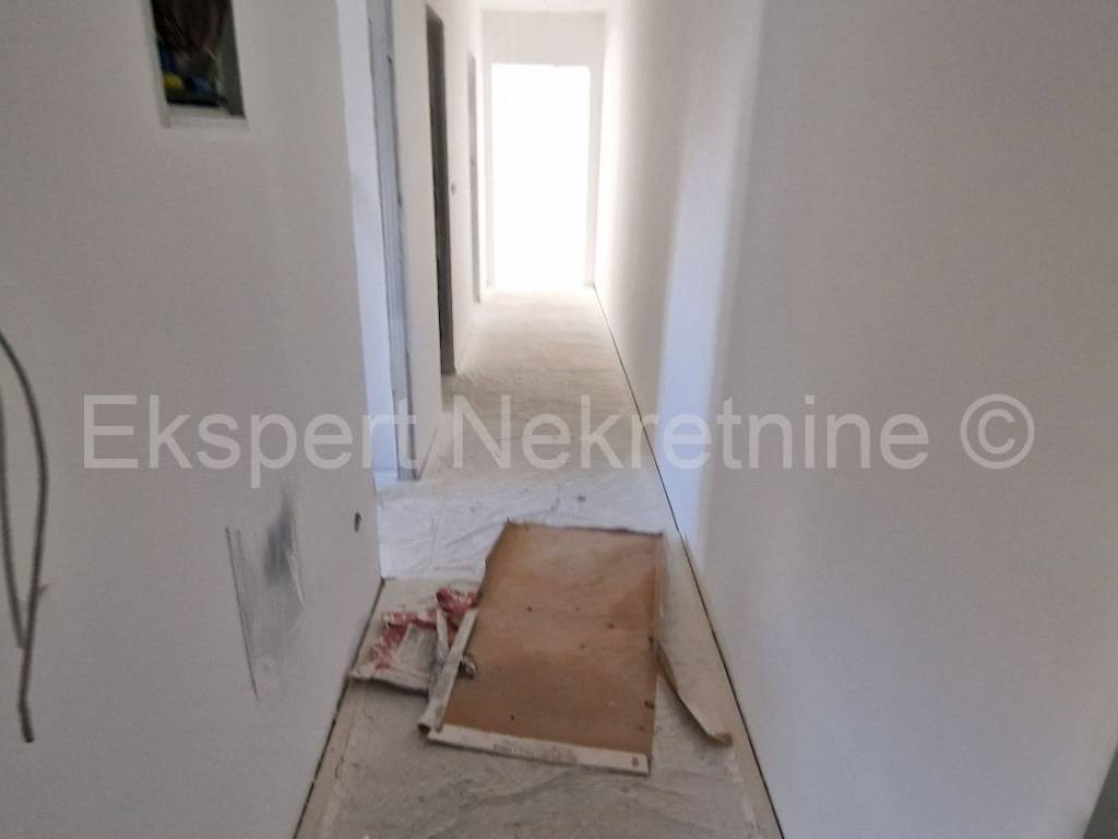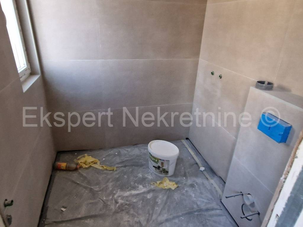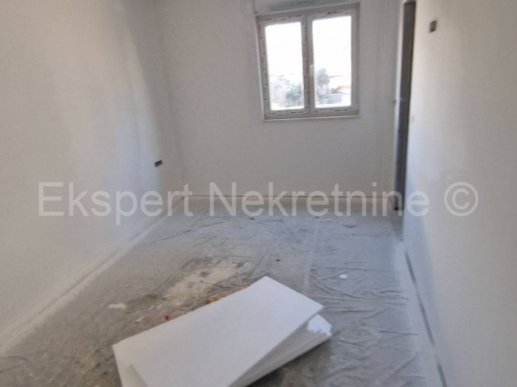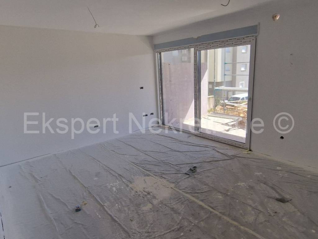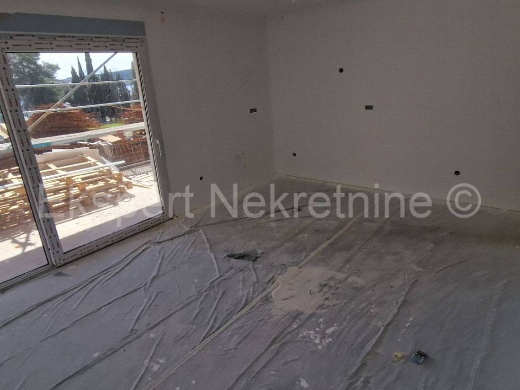 Seget Donji, two-bedroom apartment 71 m2 (57m2 apartment plus 14m2 balcony) in a new building with an elevator, on the ground floor, south-facing, with a large loggia (14 m2) with a sea view in a building in an excellent and quiet location only 200 m from the sea and the beach. The apartment has two bedrooms, one of which has its own bathroom, hallway, bathroom, kitchen with dining room and living room and a large loggia (14 m2) with a beautiful sea view.