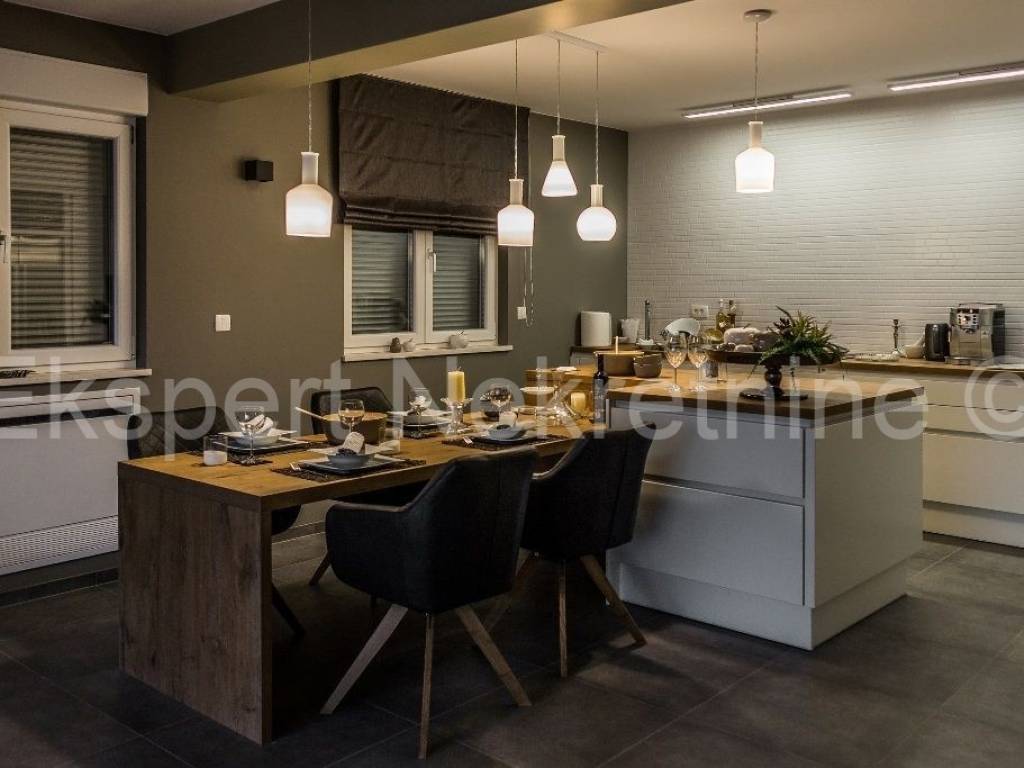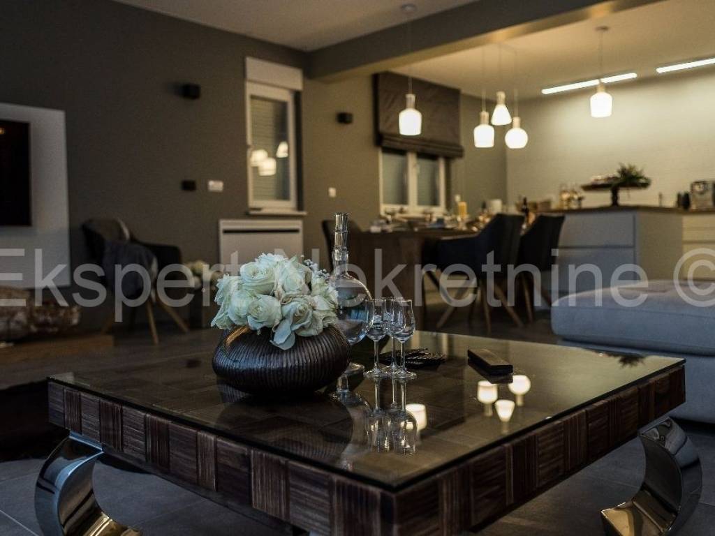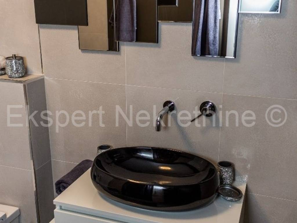 Čiovo, Okrug Gornji, luxurious comfortable 3-bedroom apartment 125 m2, in a new building, in a smaller building with only 3 apartments, with a large shared pool, The apartment is located on the ground floor of the building, and consists of three large bedrooms, a hallway, a storage room, three bathrooms with toilet, kitchen, dining room and large living room, and a large loggia with a beautiful view of the sea and the beach and a shared pool in front of the building. The apartment is about 400 m from the sea and the beach and is fully equipped with quality and modern furniture, as well as modern and high-quality ceramics and sanitary ware, and has underfloor heating with a heat pump as well as air conditioning via a fan coiler, video surveillance, etc... The complete equipment listed is included in the price of the apartment. The apartment also has an outdoor parking space.