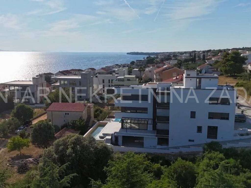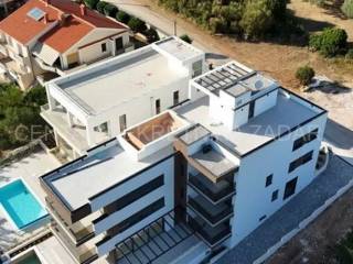 Luxury apartments for sale in a new building in Kožino, 100 m away from the sea. In the building there are four apartments: on the ground floor there is an apartment with a garden and a swimming pool, on the first floor there are two apartments, and on the second floor there is a penthouse with a roof terrace and a swimming pool. In the building there is an elevator.
