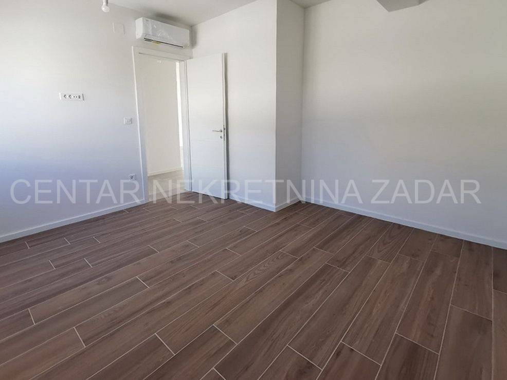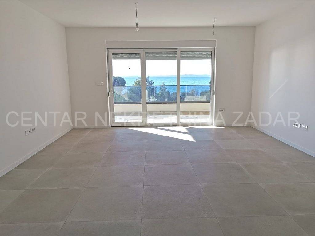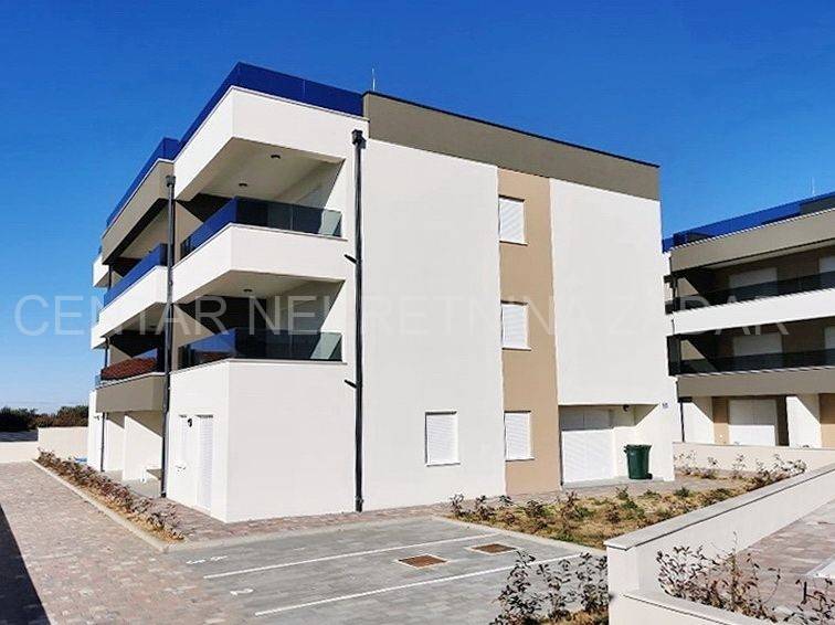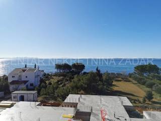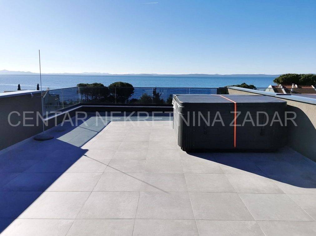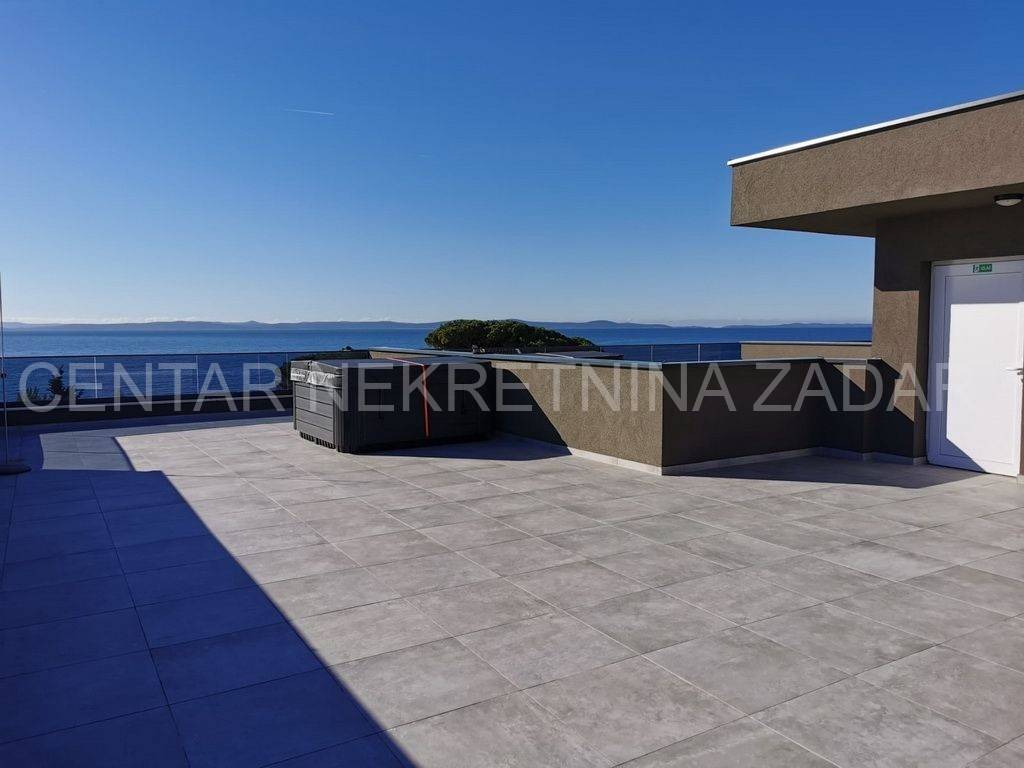 For sale is a luxurious penthouse with a roof terrace and a jacuzzi on the 2nd floor of a residential building with a total of ten residential units. The apartment has 86.46 m2, i.e. 80.03 with the coefficient, and consists of a hallway (5.76), living room with kitchen and dining room (36.84 m2), bathroom (4.29 m2), hallway (2.59 m2), two bedrooms (10.35 m2 and 13.77 m2) and a covered terrace with a sea view (12.86 m2, i.e. 6.43 m2 with coefficient). The apartment also has its own roof terrace of 88.92 m2 or 22.23 m2 with coefficient. There is a jacuzzi on the roof terrace, and the terrace offers a beautiful view of the sea and the Zadar channel! The apartment also has one outdoor parking space (12.50 m2, i.e. 2.50 with coefficient) within the property. This building also has a swimming pool for tenants in the yard, and during the design, care was taken to place it on a part of the field where the intimacy of the apartments is not disturbed.Construction by a reliable investor, high quality, functional and carefully designed floor plans. Each residential unit will have a smart Inverter air conditioning heating and cooling system, underfloor heating in the bathroom, top-quality interior carpentry with full stocks of modern design and lines, modern six-chamber PVC exterior carpentry with iso triple-layered glass and Low-e coating on the outside of renowned European manufacturers. The exterior carpentry is equipped with electrically operated ALU shutters and integrated mosquito nets. Top-quality sanitary equipment from renowned EU manufacturers, first-class parquet and ceramics, preparation for smart installation, smart key card for entering the building. The building has a video intercom, a charging station for electric vehicles, a thermal facade, and all structural elements are constructed according to the highest standards in earthquake engineering (9 seismic zones).The immediate proximity to the sea (100 m), the sea view, and the simplicity and functionality of the floor plan, along with luxury and comfort, are the features of this project that will satisfy even the most demanding customers.