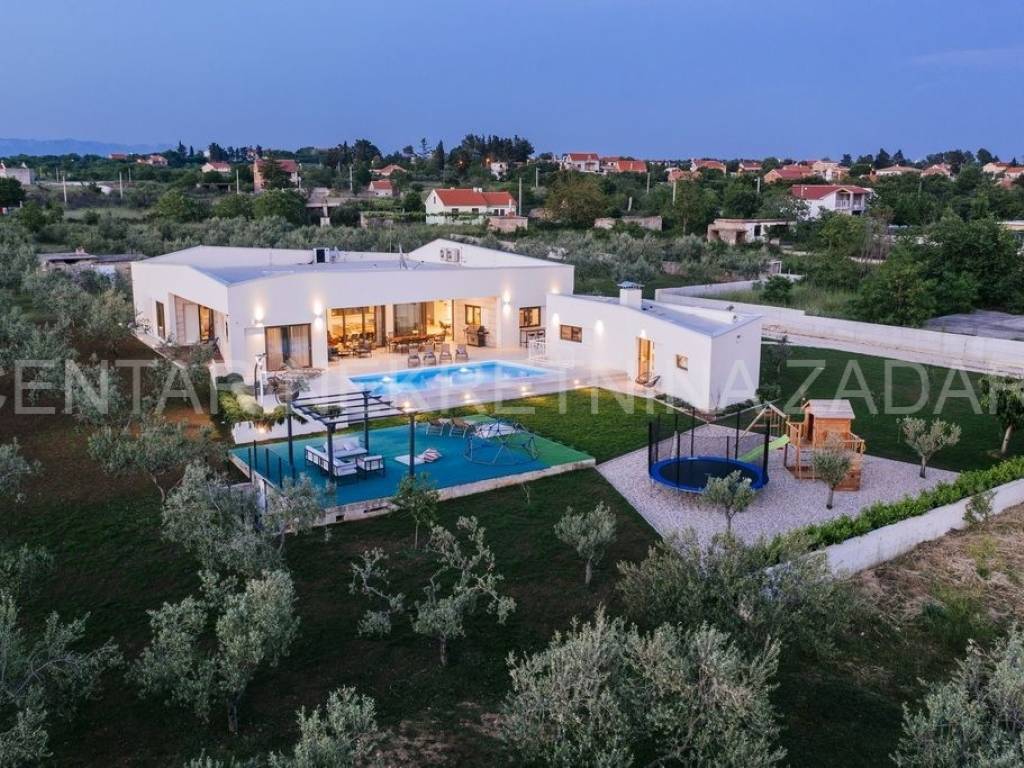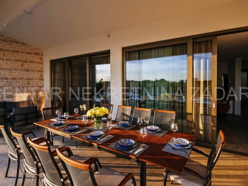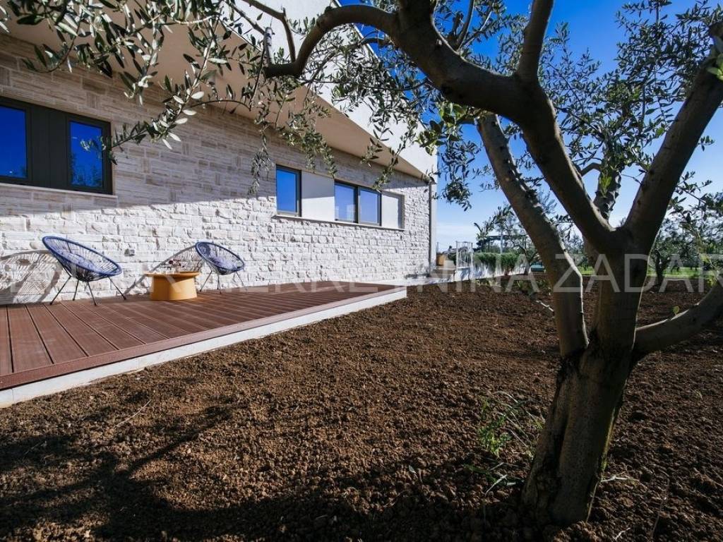 For sale is a unique newly built, modernly equipped luxury villa with pool in Smoković, near Zadar. It was built on a plot of 2850 m2. The total living area is 276 m2, has a spacious kitchen, dining room and living room, toilet, laundry and a total of 5 bedrooms with private bathrooms, equipped with expensive ceramics and toilets and carefully selected custom-made furniture. The living room has access to a large terrace next to the pool measuring 11x5, where there is also an outdoor shower, jacuzzi and entertainment area. Below the pool is the pool engine room, and as part of that space, a sauna and gym can be made. Next to the pool there is an additional facility which houses a barbecue area with toilet, bedroom with bathroom and storage. Within the house there are two garages.