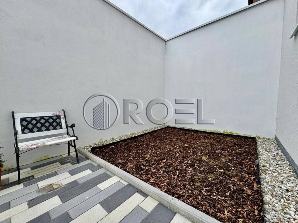 It consists of an entrance hall with access to a covered terrace (8m2) and a lawn, two bedrooms, a bathroom with a toilet, a room with a connection for a washing machine, a kitchen with a dining room and a living room with an exit to the garden. The apartment has one indoor, one outdoor storage room and an outdoor parking space with preparation for electric vehicle charging.