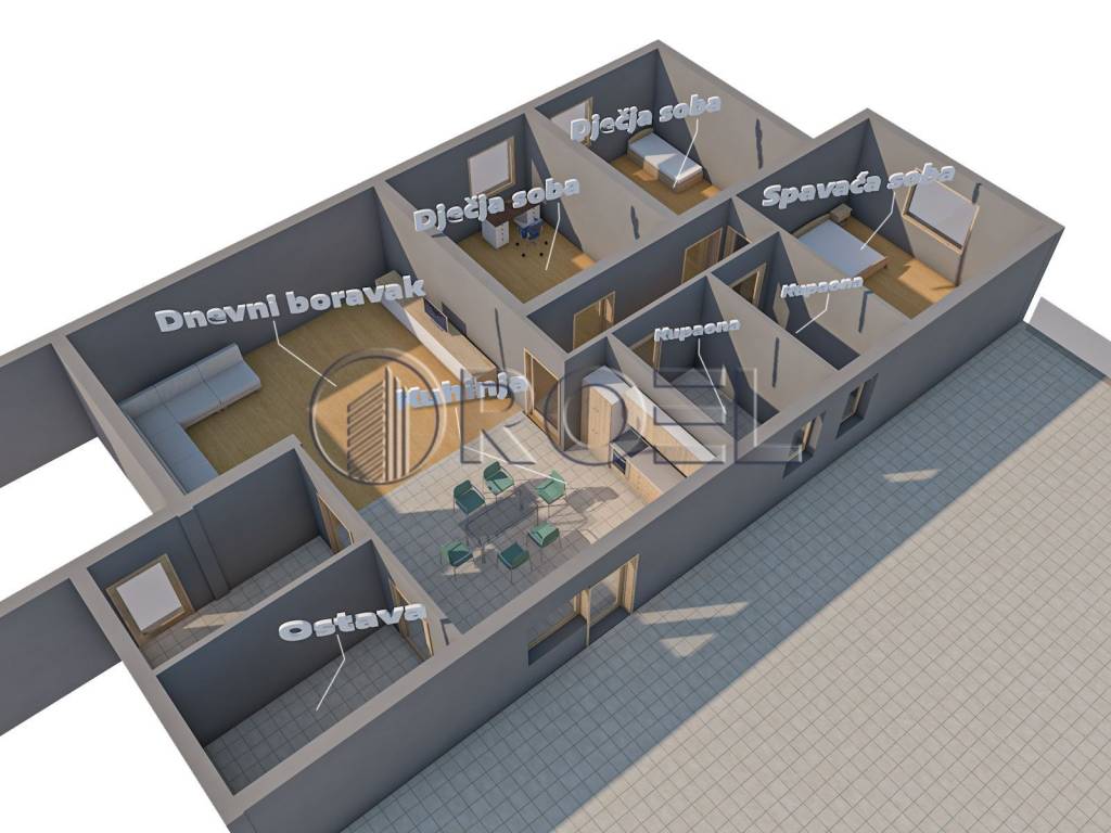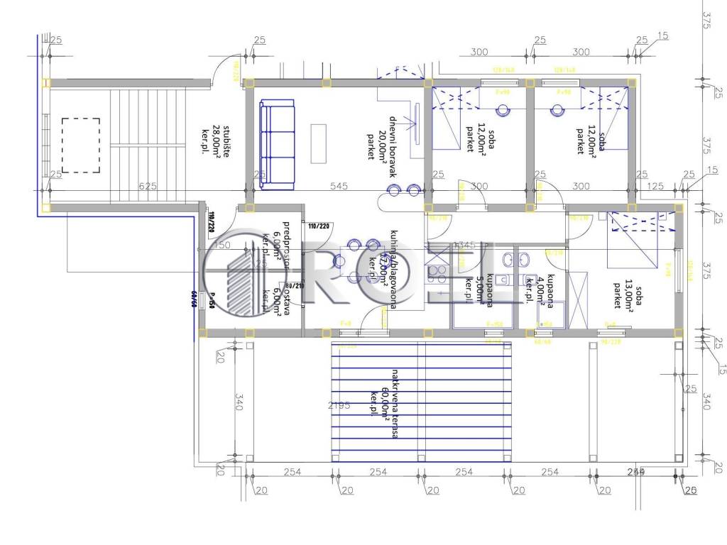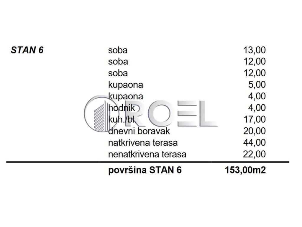 Four-room apartment (S6) located in Stupnik, NKP 107 m2. It is located on the first floor of a 2-story building. It consists of a hallway, master bedroom, two children's bedrooms, two bathrooms with toilets, kitchen with dining area, living room and a covered terrace of 44 m2 (net 22 m2) and an uncovered terrace of 22 m2 (net 5.5 m2). It is equipped with PVC joinery, air conditioning, security doors and a video intercom. The floor is covered with parquet and ceramics. The heating is underfloor with heat pumps.