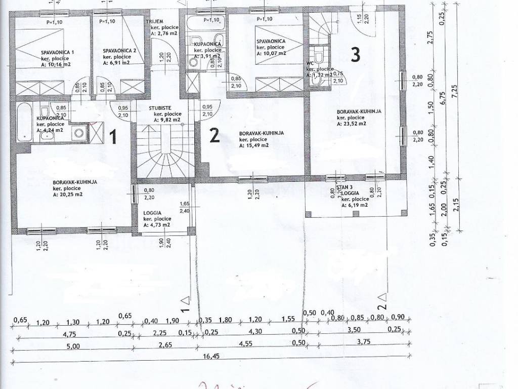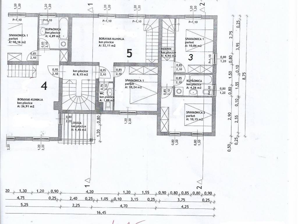 Apartment No. 3 has a separate entrance and consists on the ground floor of a kitchen with a dining room and a living room, a toilet and a loggia, the internal stairs lead to the first floor where there are two bedrooms and a bathroom. The apartment has about 32 m2 of garden and a parking space.