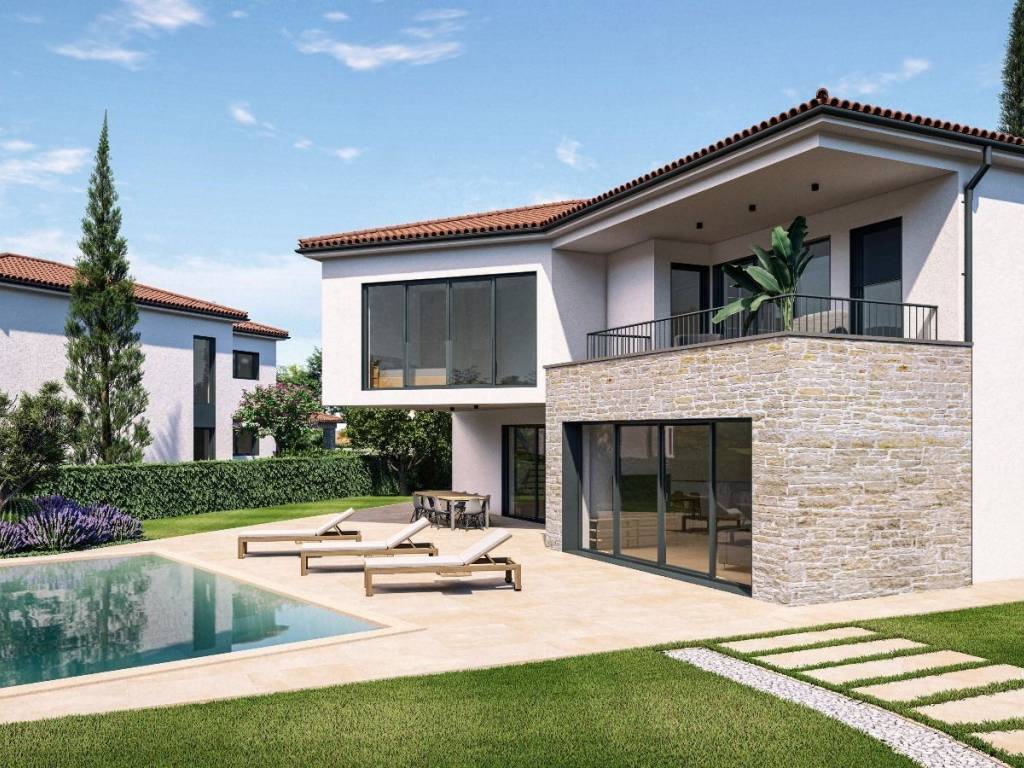 A villa under construction of 169.30 m2 with a pool of 35 m2 is for sale. On the ground floor of the villa there is a spacious living room with large glass walls with a kitchen and dining room, a bedroom, a toilet and a storage room. The living room opens onto a covered terrace where there is a swimming pool with a view of the greenery. The first floor of the villa consists of two bedrooms, one of which has its own modernly equipped bathroom, sauna and terrace with a view of the pool.