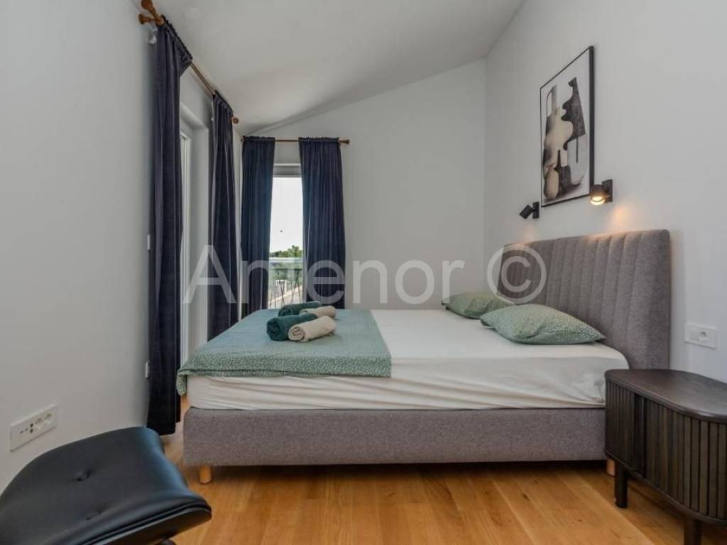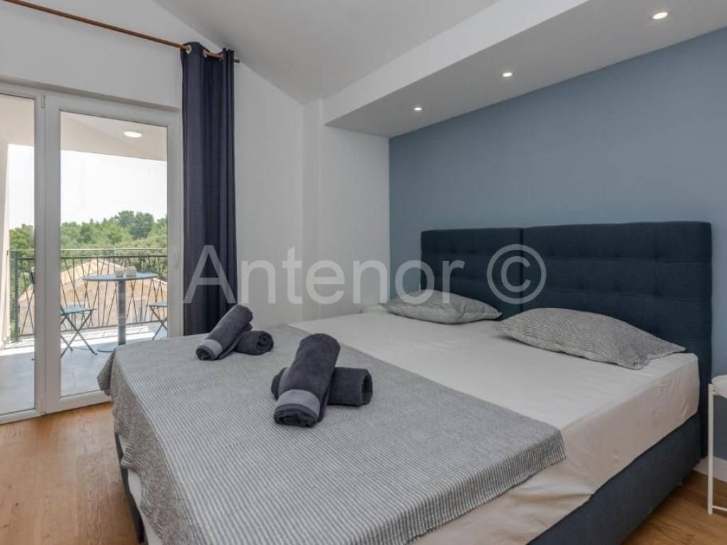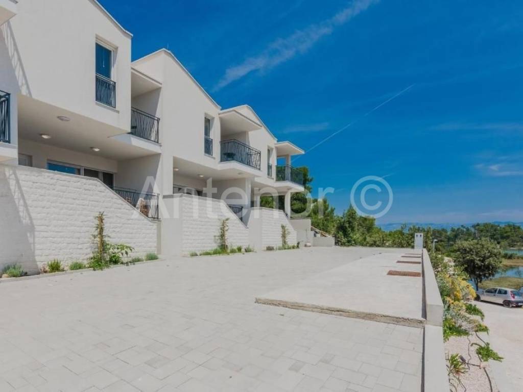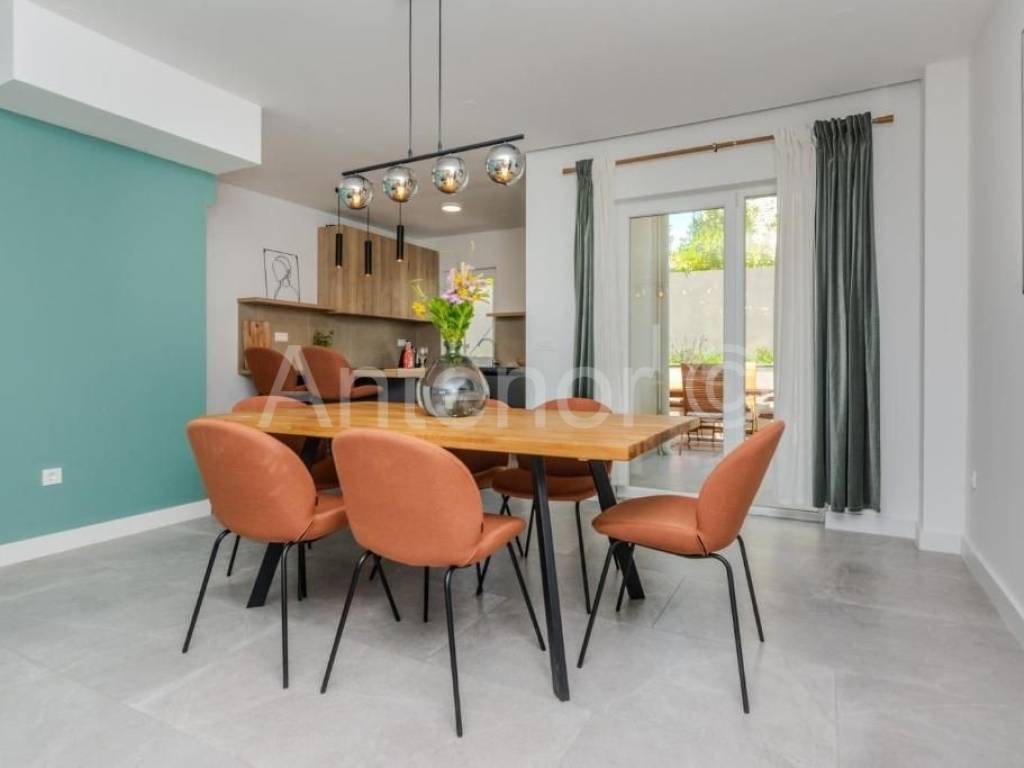 Zaton - prodaje se kuća u nizu tlocrtne površine 116 m2. Stambeni objekt se prostire na dvije etaže - prizemlje i 1. kat.U donjem dijelunalazi se ulazni prostor, ostava, wc, dnevni boravak i kuhinja. Unutarnim stubištem dolazi se na kat gdje se nalazi spavaća soba sa vlastitom kupaonicom i balkonom, te još dvije spavaće sobe, kupaonica, hodnik i balkon s pogledom na more.Apartmanse prodaje u potpunosti namješten.