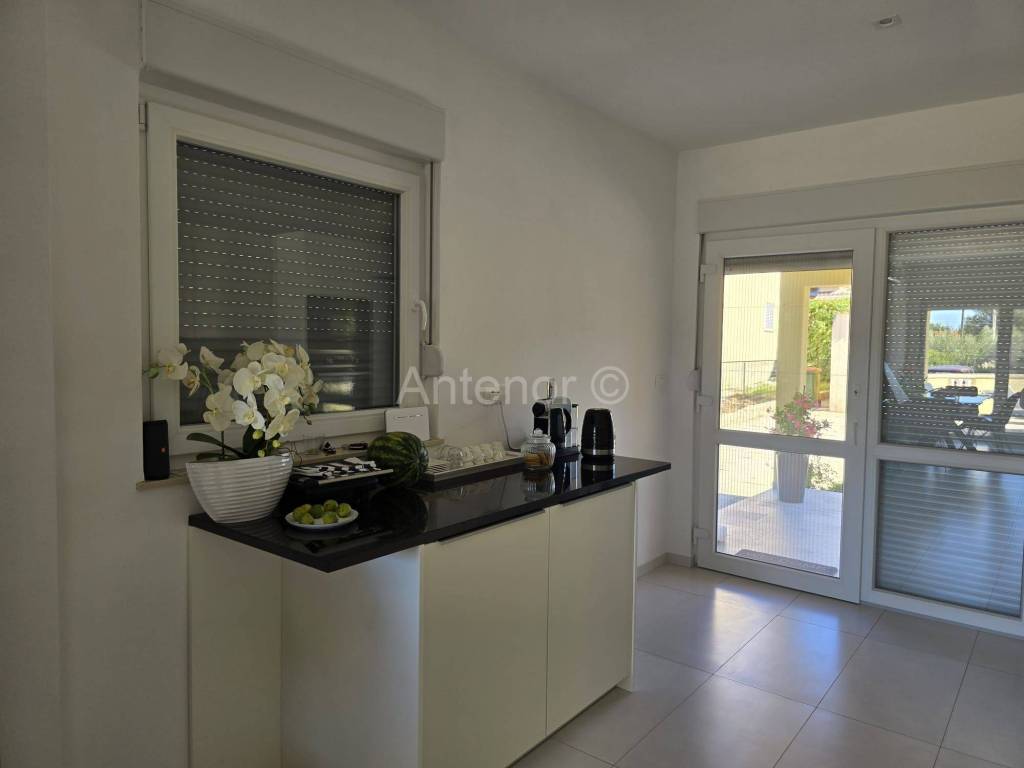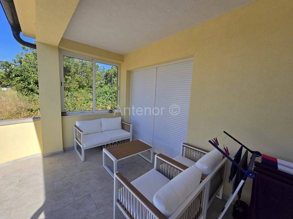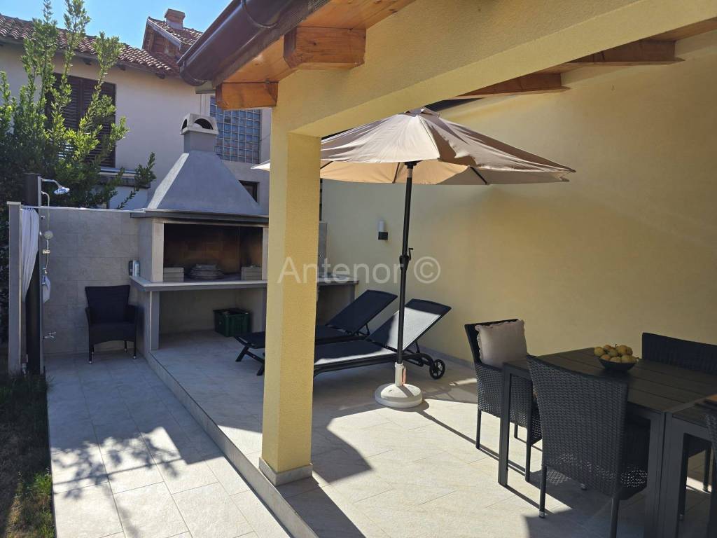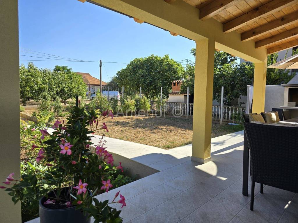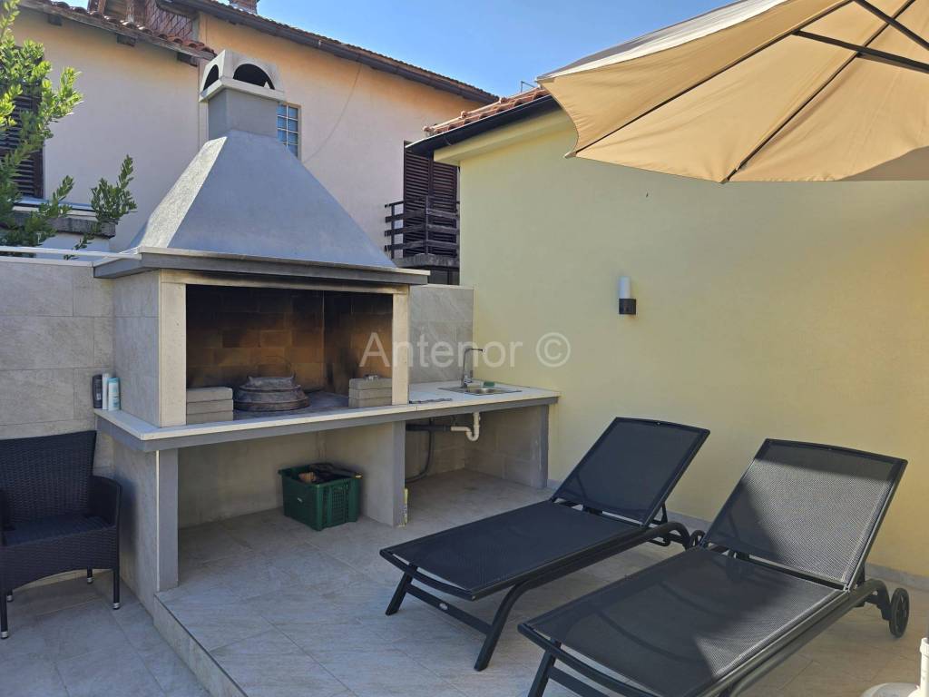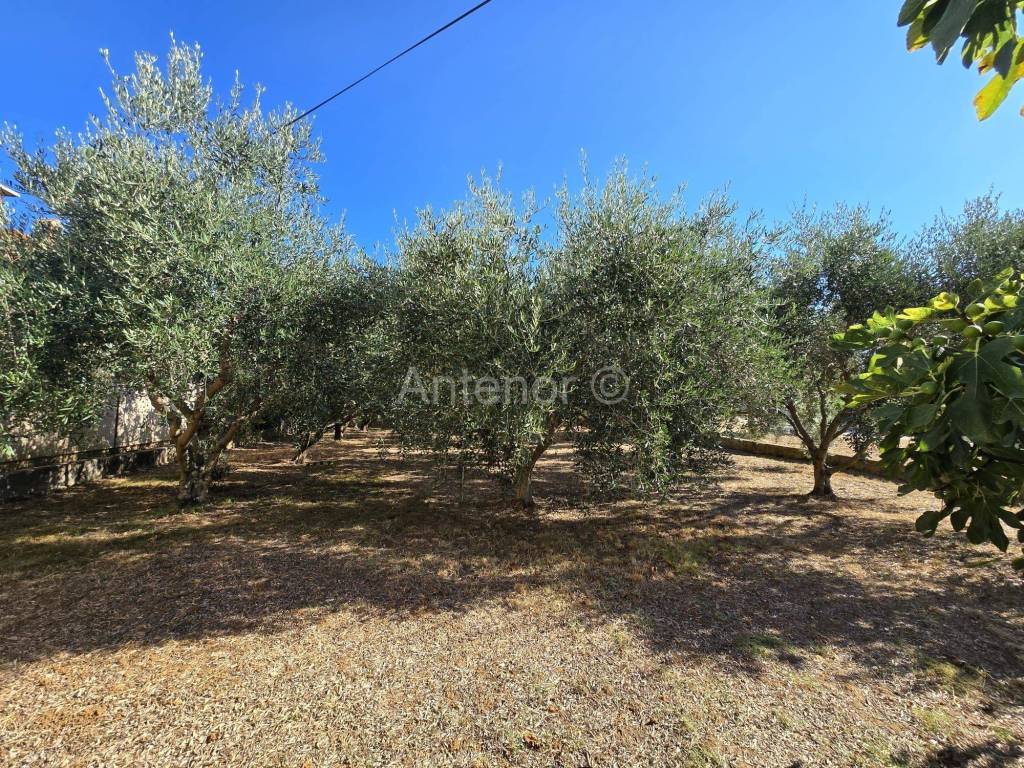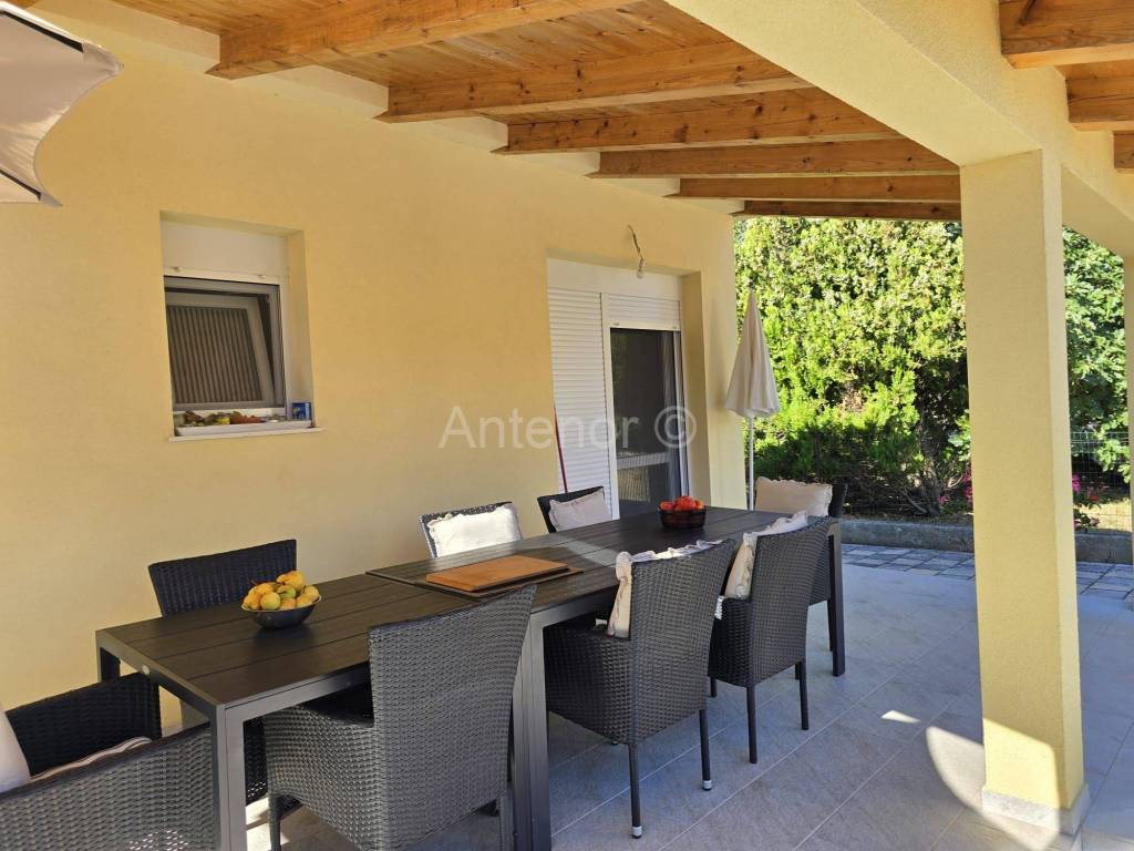 Iz terase se dolazi na prostrano dvorište gdje se nalazi tuš, roštilj,garaža, nekoliko parkirnih mjesta,spremište za alat, vrt i maslinik sa ukupno 12 maslina.