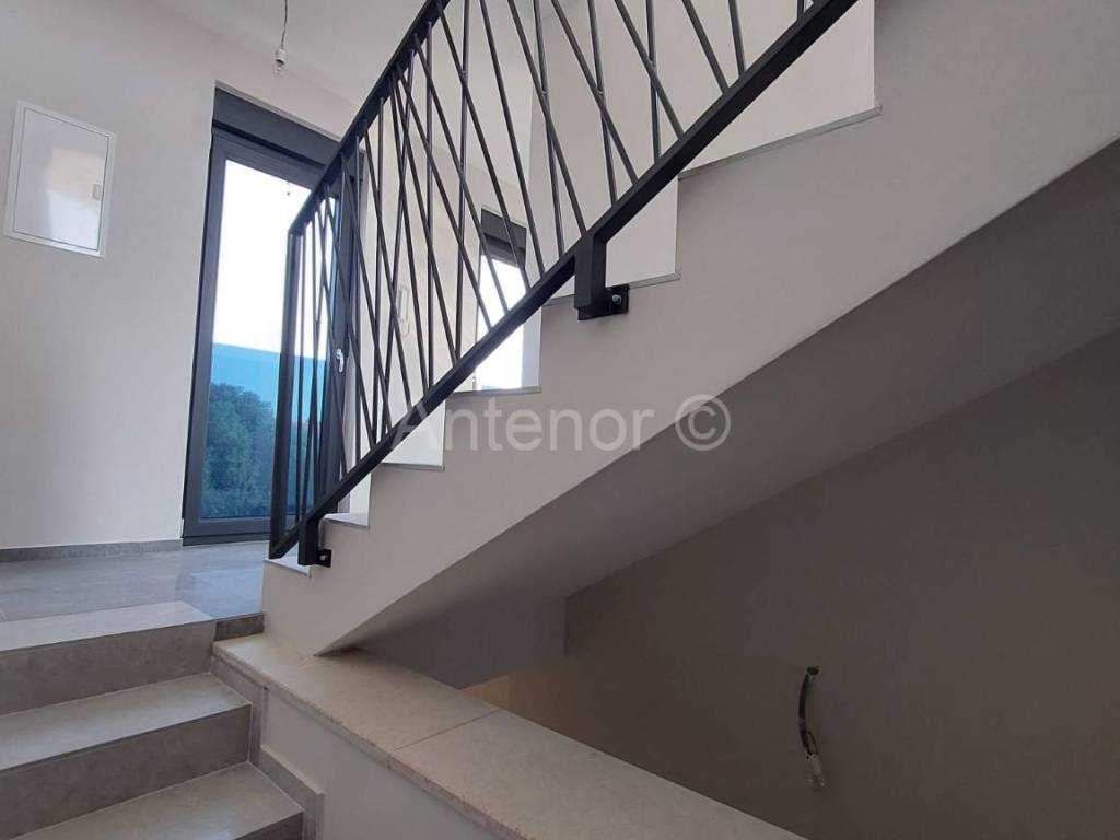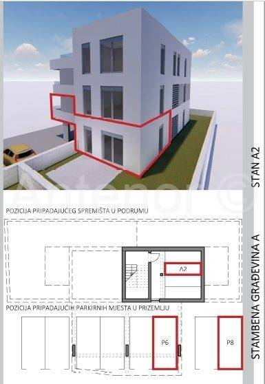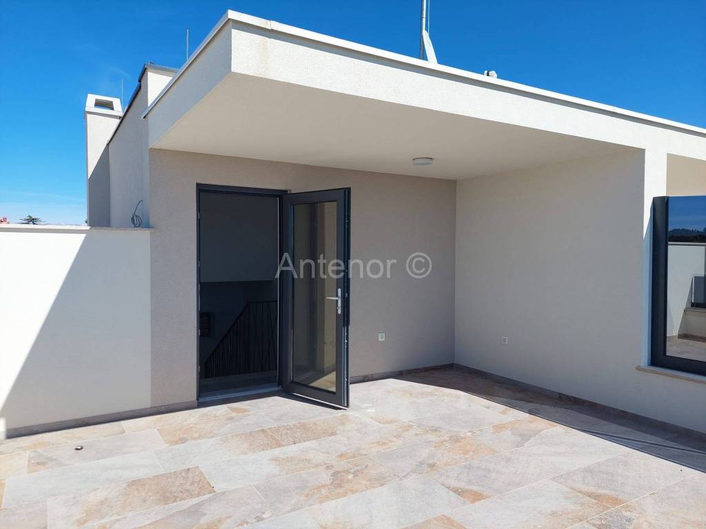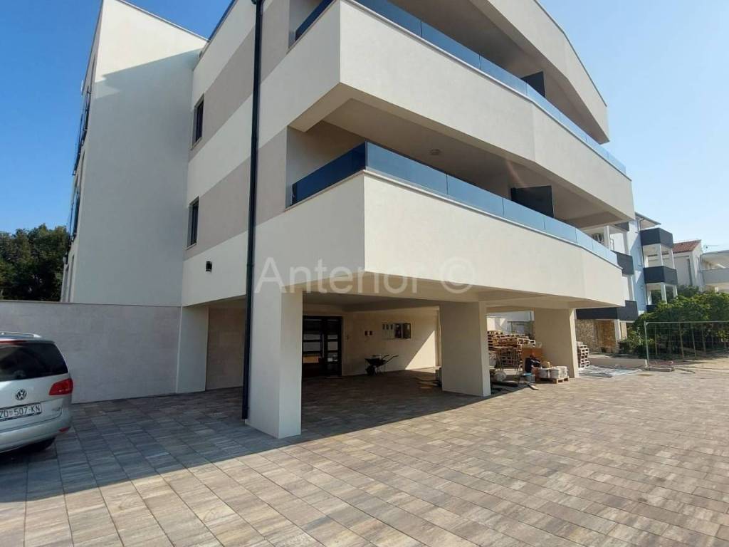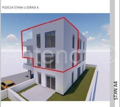 B4 - na 1. katu se nalazi ulaz, soba i kupaonica. Na 2. katu nalazi se stubište, hodnik, dvije spavaće sobe, kupaonica, balkon, predprostor, dnevni boravak i kuhinja. Tlocrtna površina apartmana je 123,63 m2. Izlazom na krovnu terasu pruža se prekrasan pogled na zadarske otoke. Krovna terasa je površine 30 m2 i dijelomično je natkrivena. Na krovnoj terasi postoje priključci struje i vode. Apartmanu pripada spremište površine 4,85 m2 te jedno natkriveno i jedno nenatkriveno parkirno mjesto.
