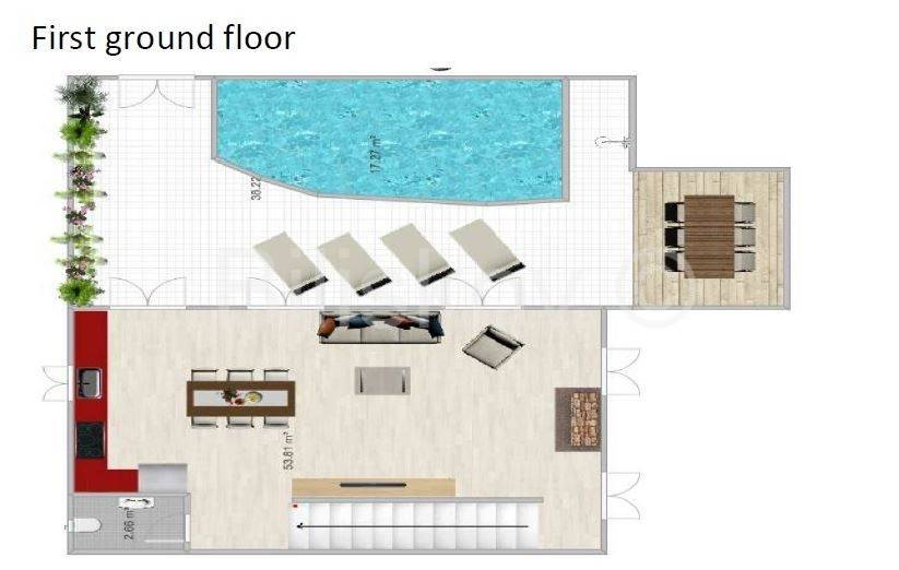 Ground floor: Large living room connected to the dining area and kitchen, with access to a spacious terrace featuring a heated pool of 17 m.