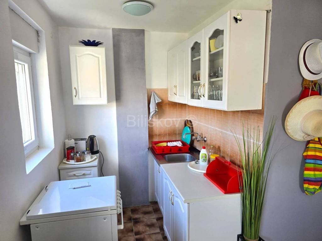 For sale is a fully furnished one-bedroom apartment of 27 m, located on the second floor of a residential building built in 1990, in Okrug Gornji. The apartment consists of a kitchen with a living room, a bathroom, and an 8 m balcony offering a stunning sea view. An outdoor parking space is included.