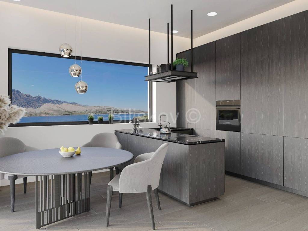 The luxury villa is situated on top of a cliff in a beautiful and peaceful environment, providing a stunning panoramic sea view. It is only 4 kilometers from the center of Pag, where all necessary amenities can be found (shops, cafes, restaurants, pharmacy, school).