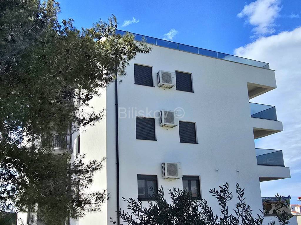 Trogir, Čiovo, stan površine neto površine 74,30 m2, s natkrivenom terasom 16,38 m2na trećem katu, s krovnom terasom 98,58 m2 na četvrtom katu, u novogradnji s liftom.