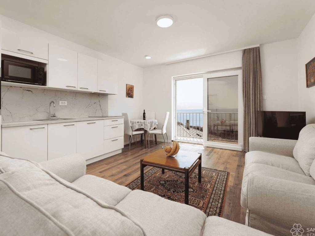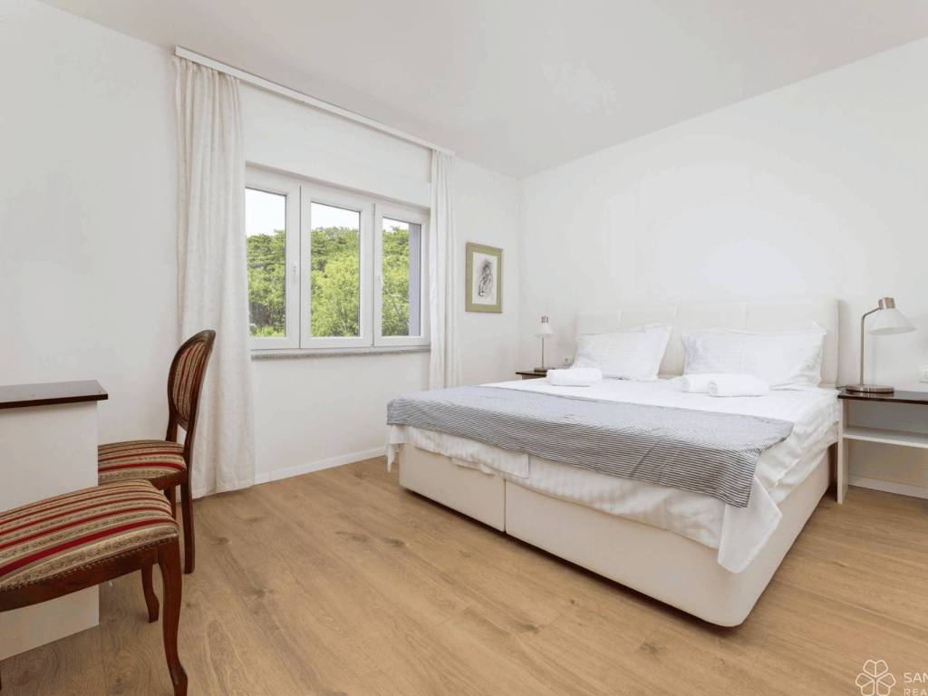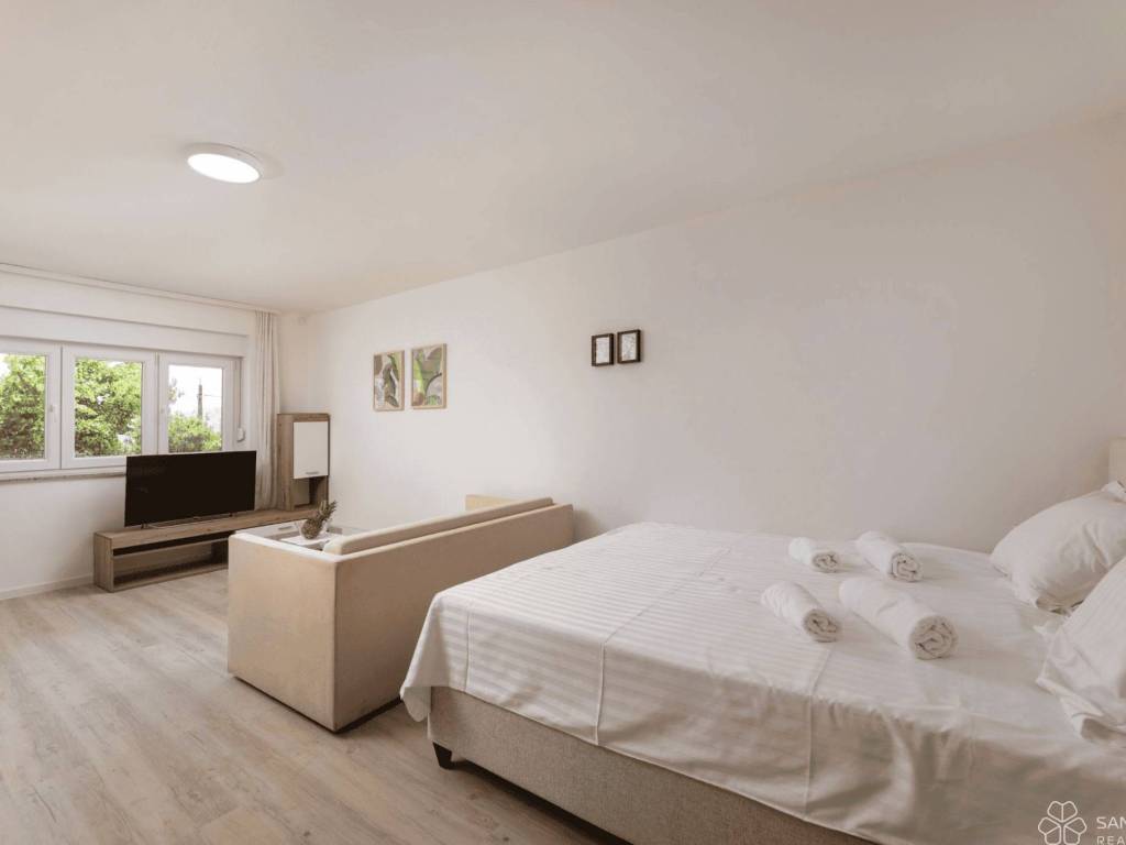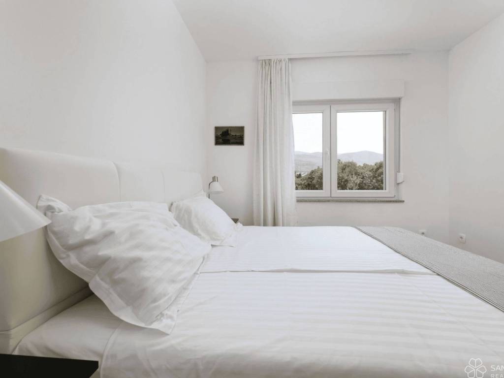 The villa is spread over three floors, with a total living area of 240 m, and each level constitutes a separate residential unit. In the basement there are two apartments with their own entrances, fully equipped and air-conditioned, ideal for guests or tourist rental. On the ground floor and on the first floor there are spacious apartments consisting of a living room, open-concept kitchen and dining room, two bedrooms, two bathrooms and covered balconies with a beautiful sea view. The villa was completely renovated in 2021, equipped with modern furniture, elegant kitchens with appliances and bathrooms covered with large marble imitation tiles.