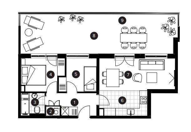 Stan će se nalaziti na drugom katu zgrade, ukupne prodajne površine 71,15 m (ukupna neto površina poda iznosi 86,55 m, a sastoji se od ulaznog prostora, open-space dnevnog boravka s blagovaonicom, kuhinje, dvije spavaće sobe, kupaonice, natrkivene terase, loggie i spremišta.