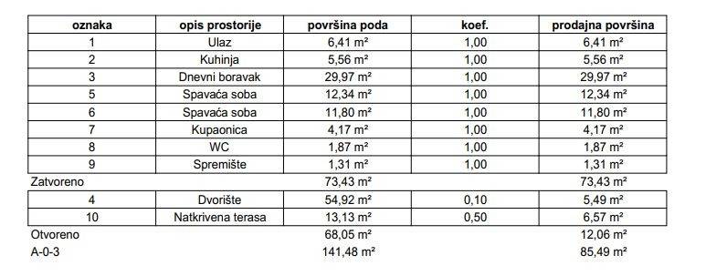Stan će se nalaziti u prizemlju zgrade, ukupne prodajne površine 85,49 m (ukupna neto površina poda iznosi 141,48 m), a sastoji se od ulaznog prostora, dnevnog boravka s blagovaonicom, kuhinje, dvije spavaće sobe, kupaonice, zasebnog WC-a, natkrivene terase, dvorišta i spremišta.