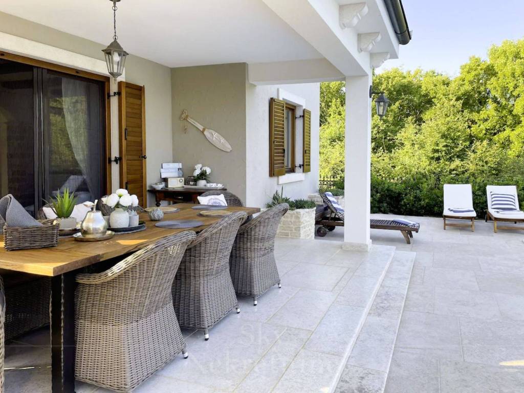 Nekretnina se sastoji od prizemlja i prvog kata. Na prizemlju se nalaze open-space dnevni boravak, kuhinja, blagovaona, kupaona, spremište te jedna spavaća soba. Iz dnevnog boravka izlazi se na natkrivenu terasu, a okućnica od 500 m2 obuhvaća grijani bazen i sunčalište smještene u dvorištu, kao i prostor za druženje te ljetnu kuhinju s roštiljem.