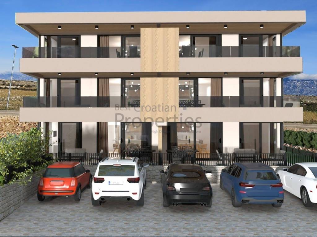 Na prodaju je moderno dizajniran dvosoban stan u prizemlju zgrade sa svega šest stambenih jedinica, smještene u mirnoj ulici novog naselja u Povljani, svega 350 metara od mora i prve plaže. Zgrada je u izgradnji i projektirana je za energetski razred A+, s vrhunskim standardima gradnje, termo, hidro i zvučne izolacije te suvremenim sustavima grijanja i hlađenja.