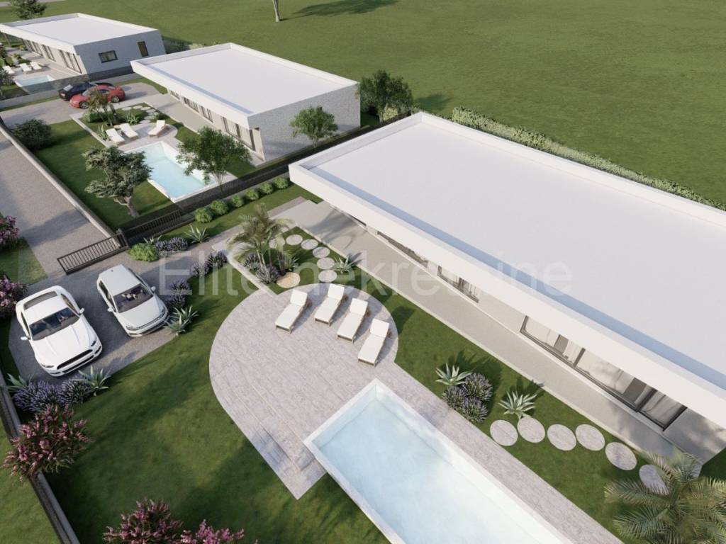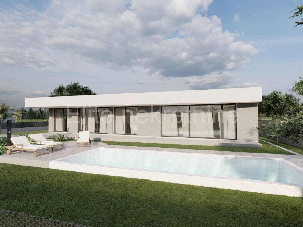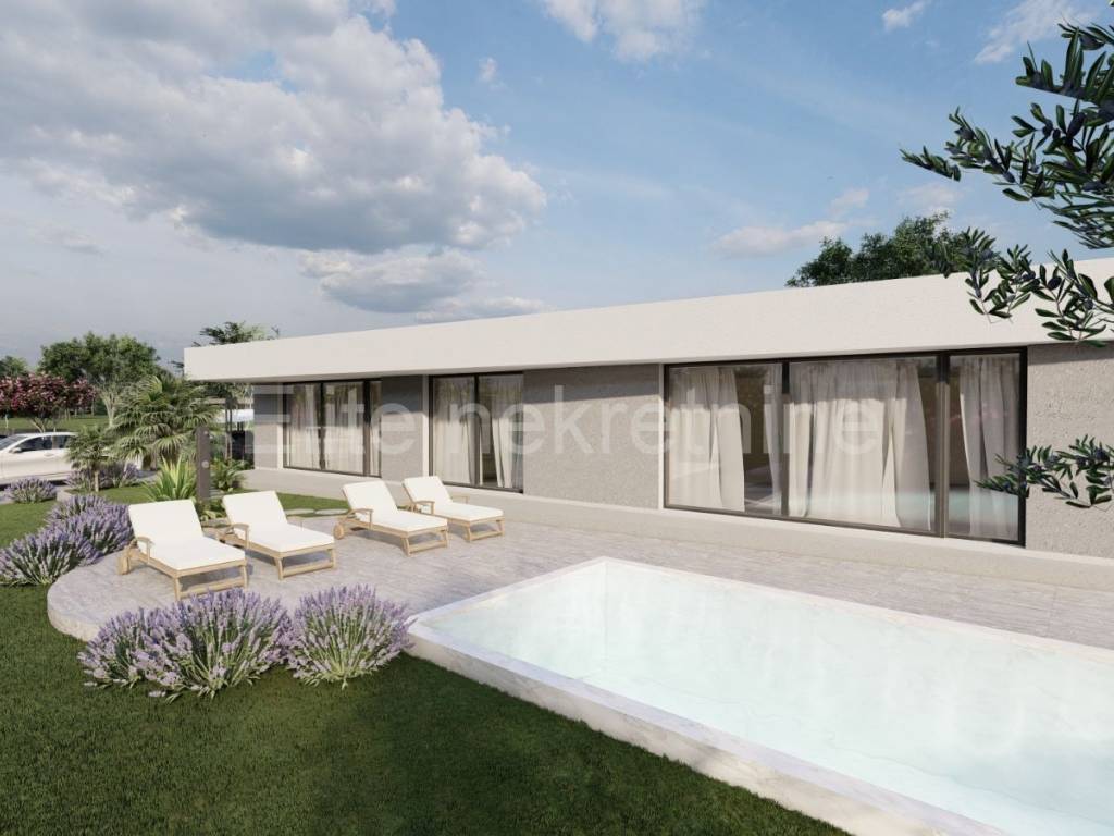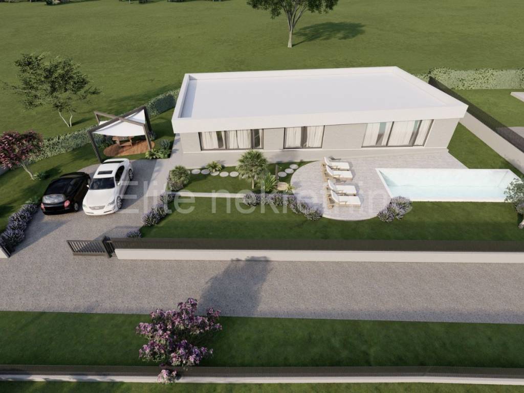 Nedeščina - modern one-story house of 172.45 m2 with a swimming pool The small town of Nedešćina is located in the vicinity of Labin. The tame Istrian place is surrounded by greeneryand is the perfect place for a vacation or a quiet life all year round.It is 5 km from the charming center of Labin, with all tourist, administrative and commercial facilities.and the beautiful beaches of Rabac are 8 km away.This villa with a swimming pool is located on the edge of Nedeščina. It is the last one in the construction area and in front of it is an acacia forest.Modern and simple design with a yard of 616m2, with a swimming pooland with a view of the forest in front of it, this villa offers complete peace and comfort. It has two residential units.The main part consists of a large, living area, a master bedroomwith a bathroom and two more bedrooms that share a bathroom. It also has a smaller storage room.The villa also has a guest suite with two bedrooms, a larger living room, and a bathroom.In front is a paved area for enjoying sunbathing, socializing or swimming in the pool.The living rooms and the master bedroom are connected to the outside area and the pool by sliding walls.It will have underfloor heating with a heat pump and will also be additionally air-conditioned.There are two parking spaces in the yard.Construction is underway and completion is expected in March 2024.The villa will be completely finished with landscaped surroundings.In agreement with the buyer, furniture can also be included.The villa also includes the use of a small park for childrenIf you are looking for a villa in Istria for an ideal holiday or a peaceful, high-quality family life, this is an excellent choice.