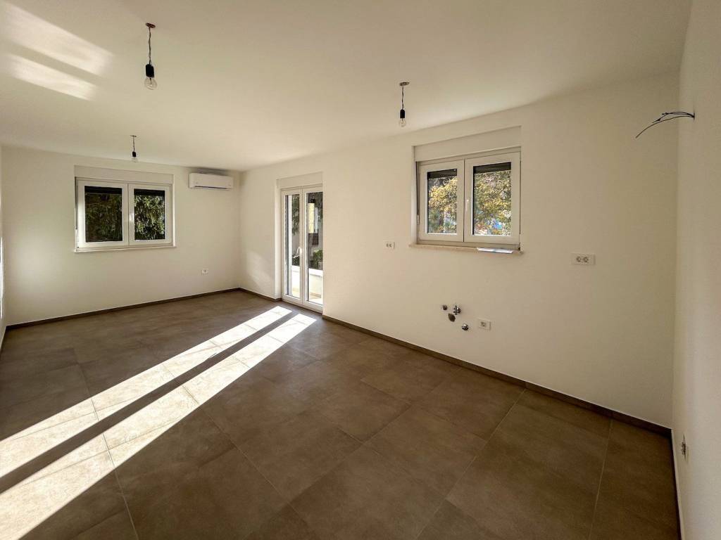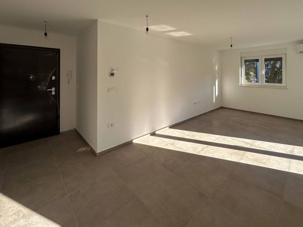 The apartment consists of a spacious open-plan living room with kitchen and dining area, two bedrooms, and a modern, fully equipped bathroom with high-quality ceramic tiles.