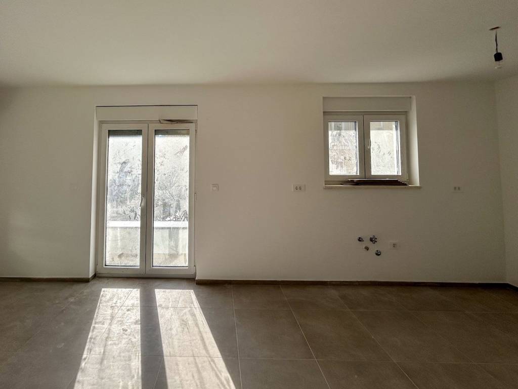 The apartment consists of a spacious open-plan living room with kitchen and dining area, two bedrooms, and a modern, fully equipped bathroom with high-quality ceramic tiles.