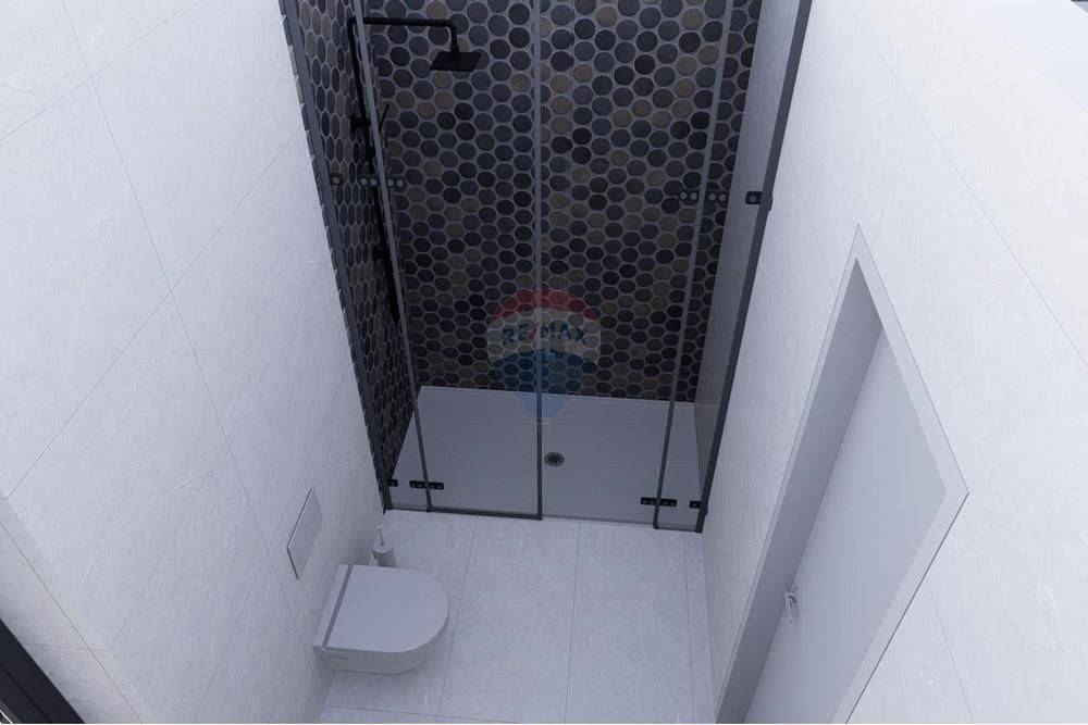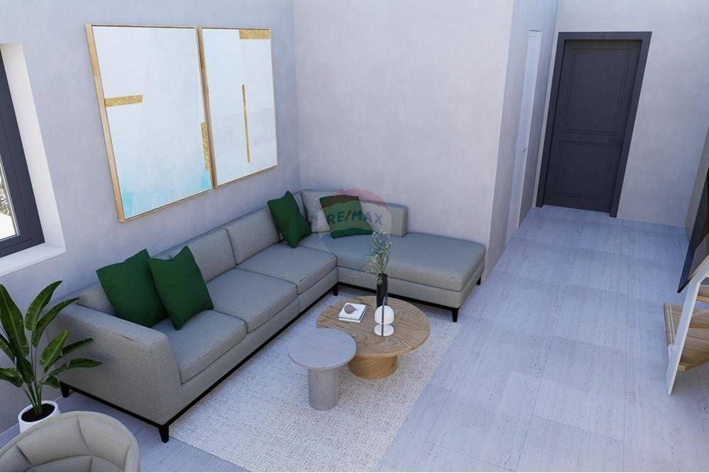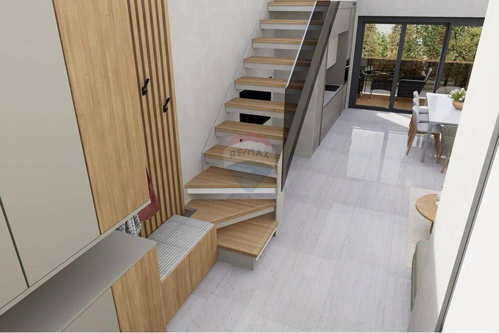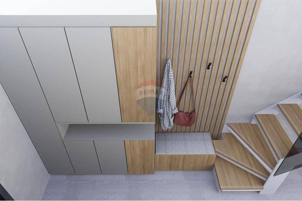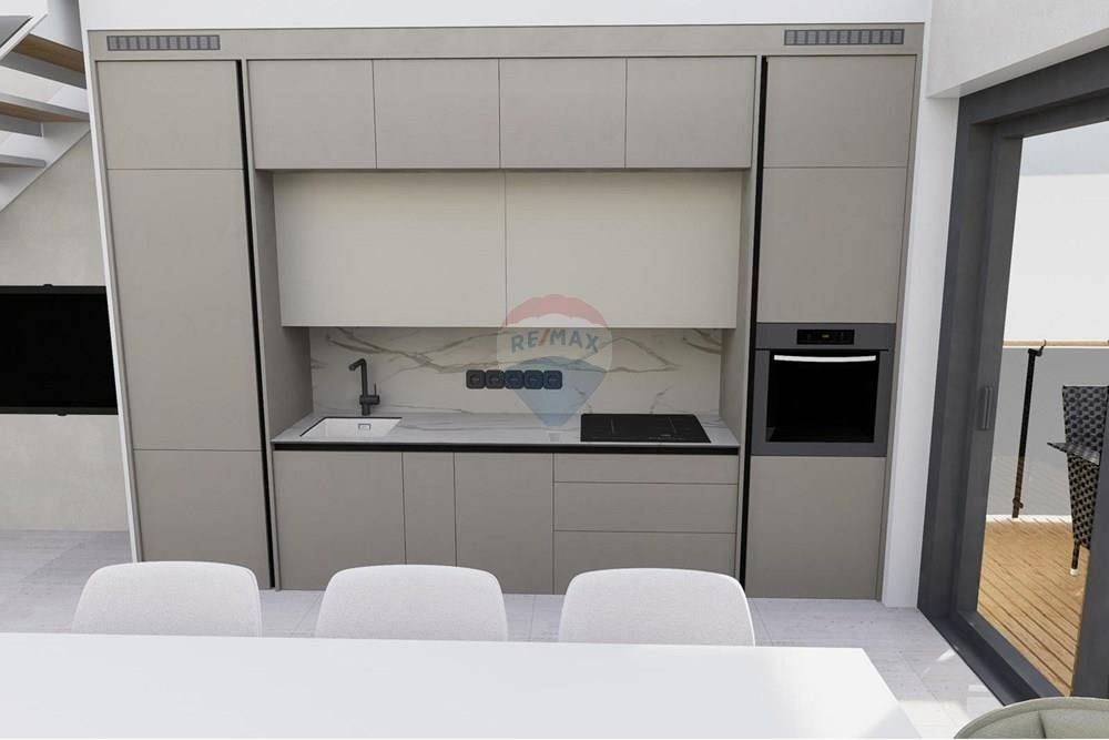 The ground floor of the apartment consists of a hallway (6.30m2), a bathroom (4.95m2), a spacious open space of the kitchen, dining room and living room (30.80m2) and a covered porch and terrace (3.60m2 and 8.14m2).