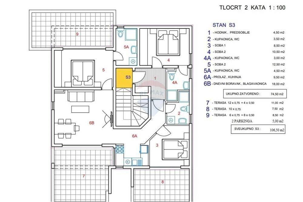 A four-room penthouse apartment in a new building with a shared pool of 106m2 is for sale, in Novalja on the island of Pag.