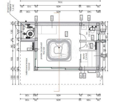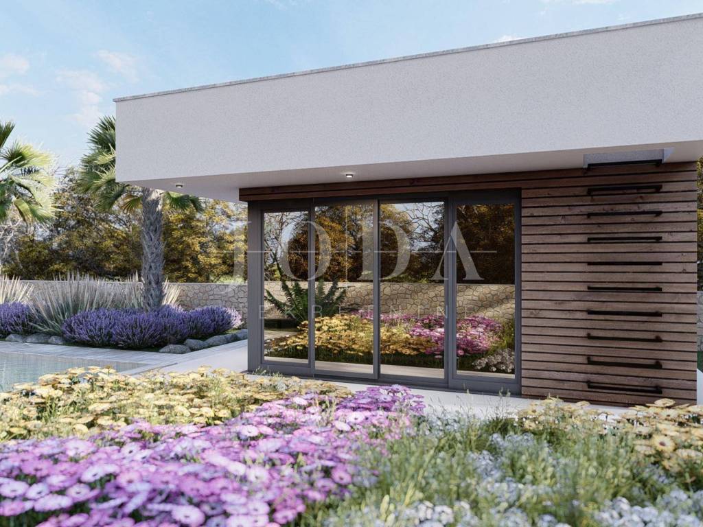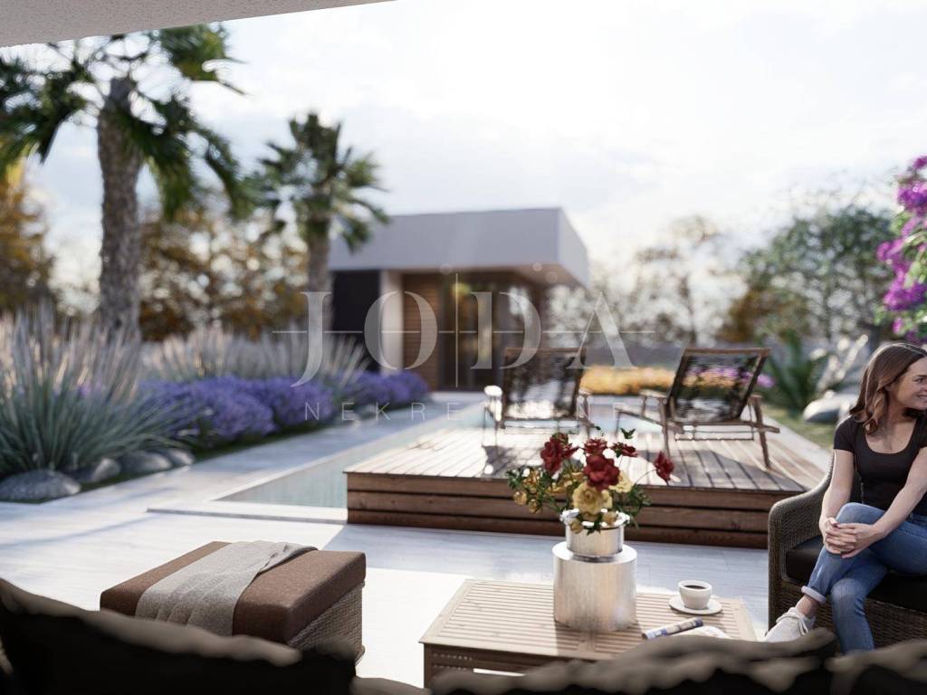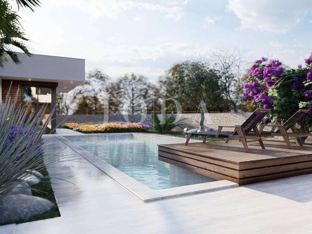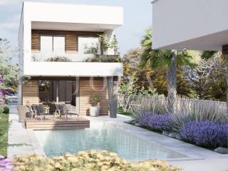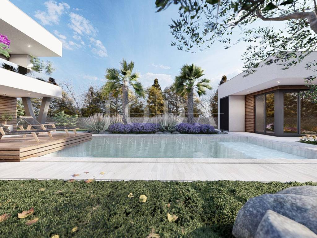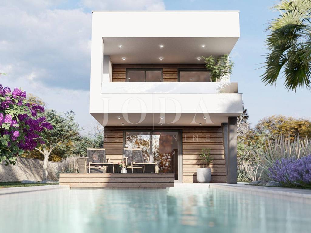 A detached house is being built on a plot of 690 m2, with an auxiliary building and a swimming pool, gross area of 213 m2, net area of 191 m2. On the ground floor of the building there is an entrance hall, bedroom, bathroom, storage room, kitchen, dining room, living room, and on the first floor there are 3 bedrooms, 2 bathrooms, a hallway, balcony and terrace. A 38 m2 swimming pool and an auxiliary building - wellness are designed. Top quality materials and equipment are used in the construction, and the property is subject to VAT. The distance from the sea is 3500 meters and the move-in is scheduled for the end of 2026.