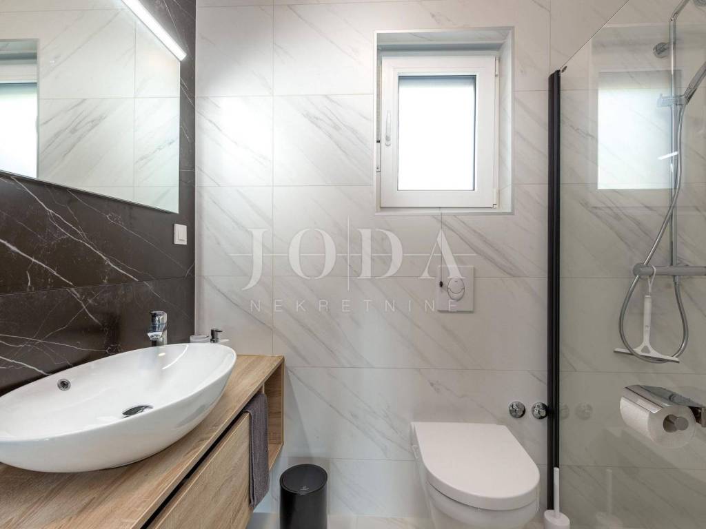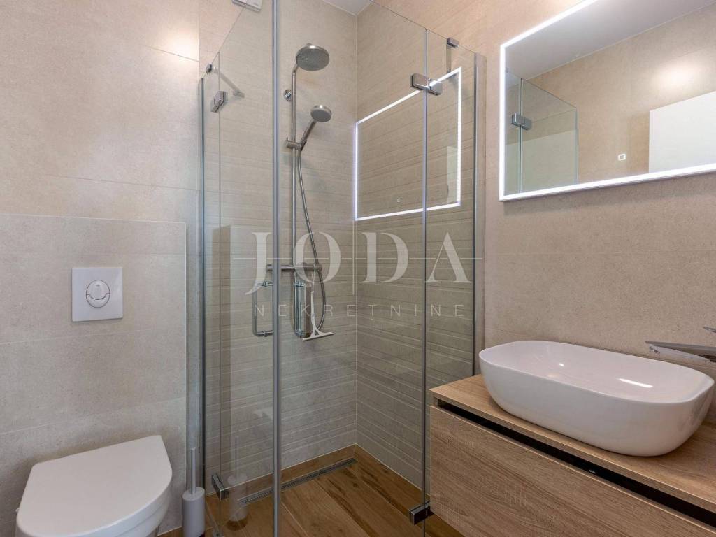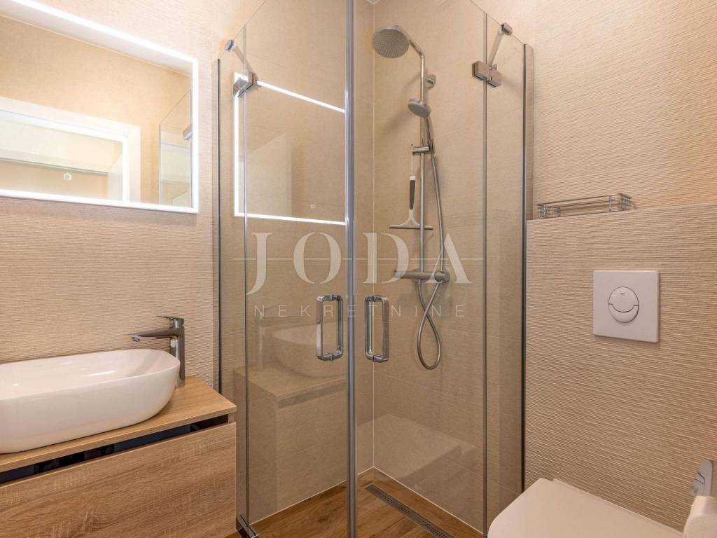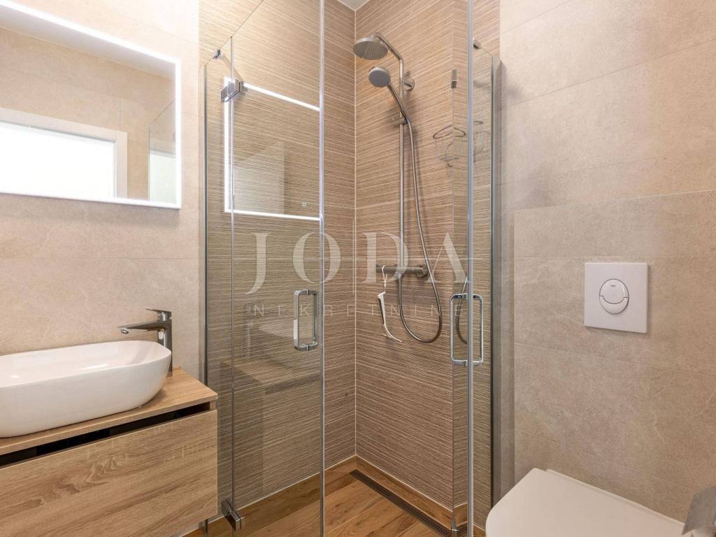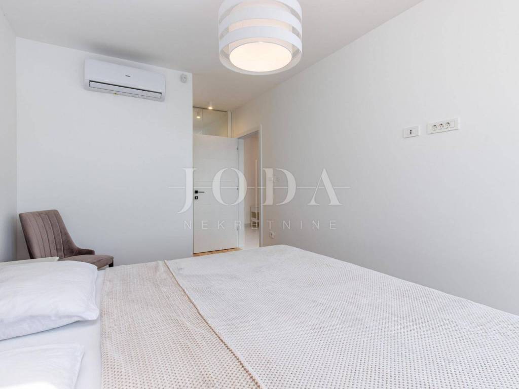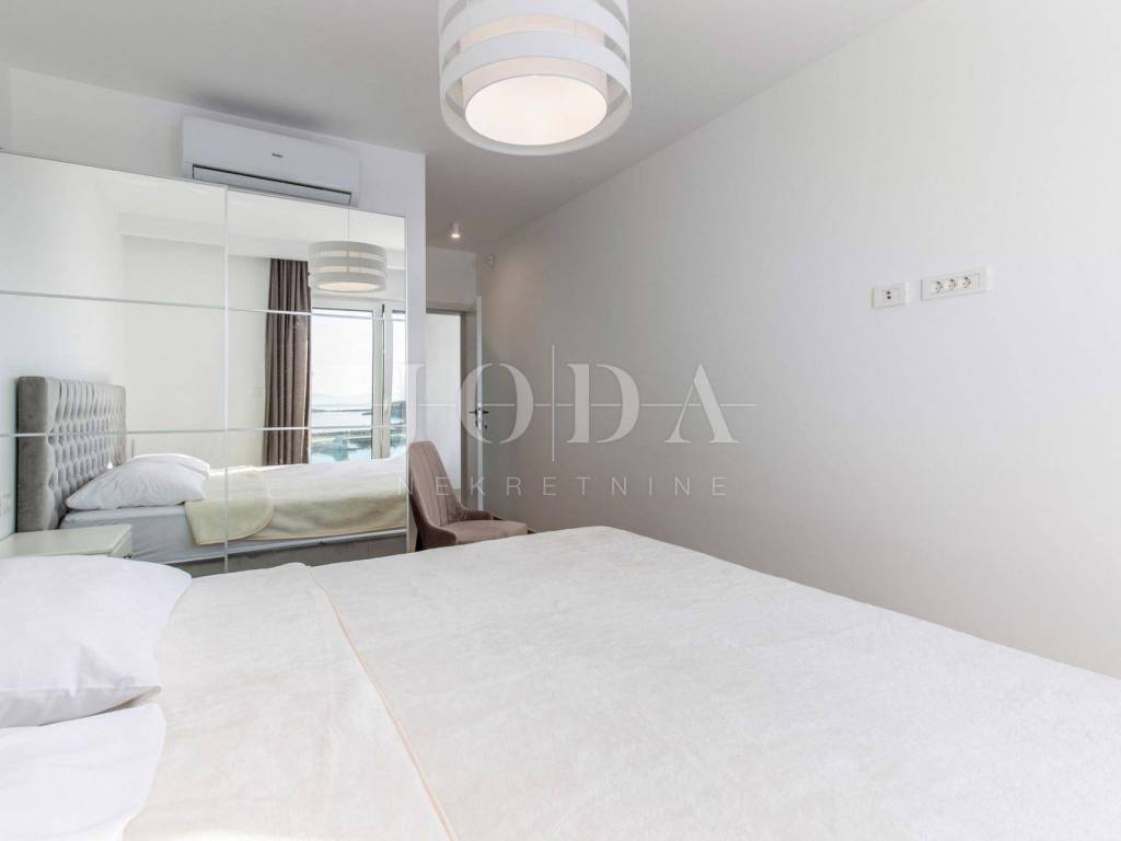 In a unique location we sell high quality new building 1st row to the sea. The apartment consists of three bedrooms, each with its own bathroom, another bathroom, large storage room and kitchen with dining area and living room from which leads to the terrace. Underfloor heating throughout the apartment with the ability to set the temperature in each room separately. Air-conditioned building with only three apartments, each with two parking spaces. The apartment has 114 m2 of living space in the lower floor and 80 m2 of attic owned by the hall. Great location.