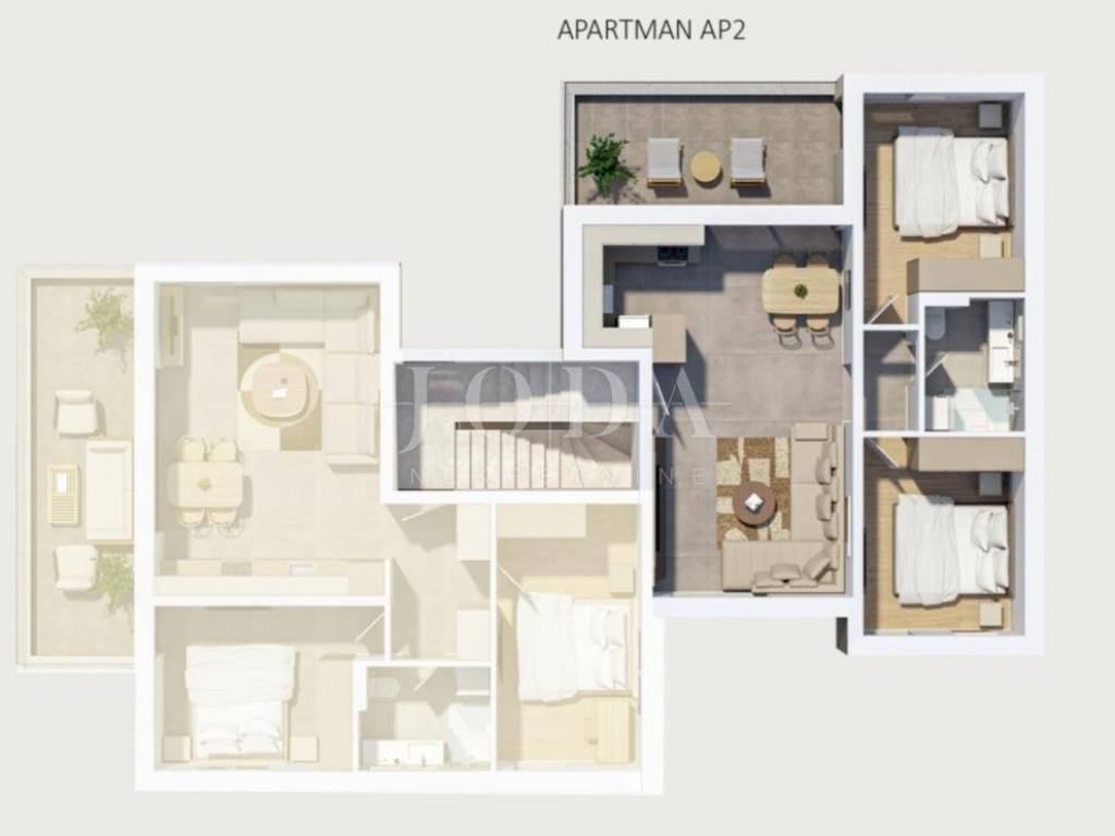 The ground floor apartment has a large garden, while all other apartments have beautiful balconies and a beautiful sea view. The planned completion of the works is summer 2025.