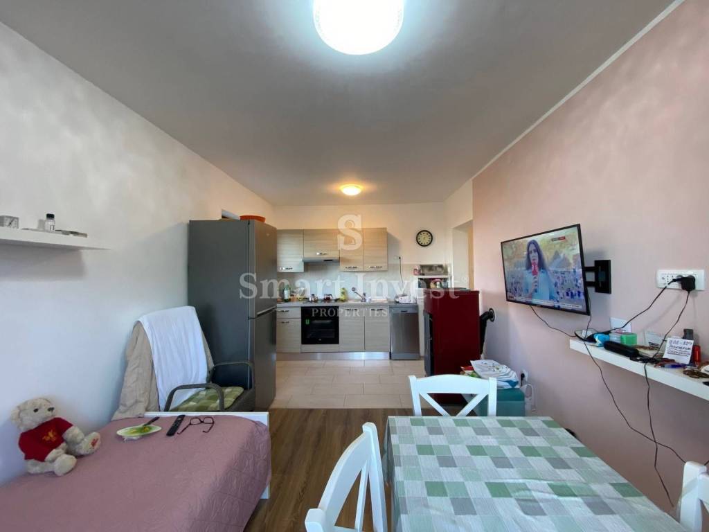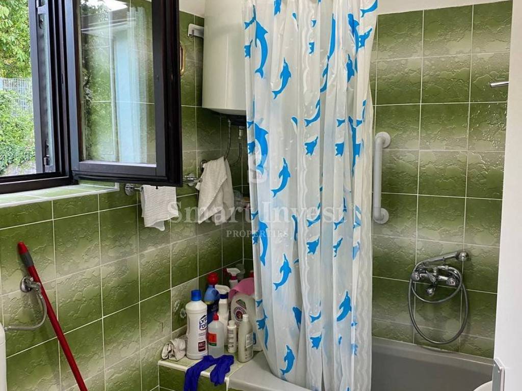 On the ground floor there is a storage room, a space that is in the unfinished phase, while on the first floor there is a beautiful two-bedroom apartment with a terrace and a view of the sea.