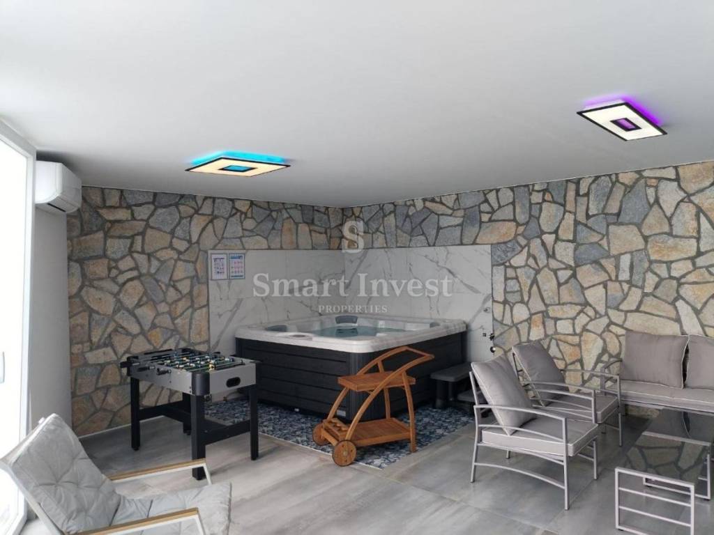 The living room opens onto an enclosed terrace (wellness area) with its own air conditioner, available year-round. It features everything needed for relaxation, fun, and spending time with family and friends: a 6-person jacuzzi, table football, a large outdoor pool, and a seating area.