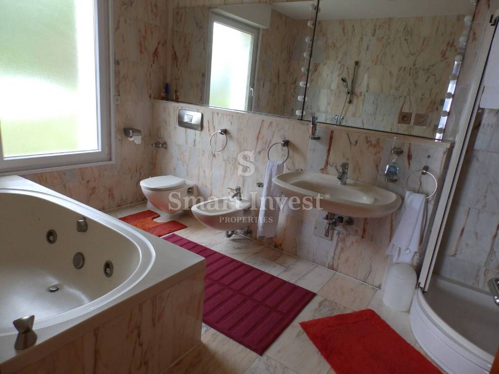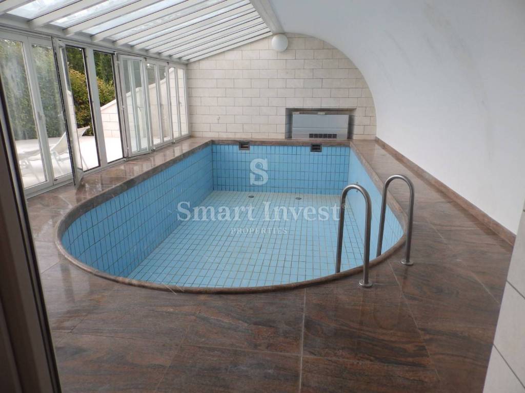 On the ground floor of the villa there is a living room, a kitchen with a dining area, a bathroom, a hobby area, and an indoor pool, while on the first floor there are 4 rooms with their own bathrooms.
