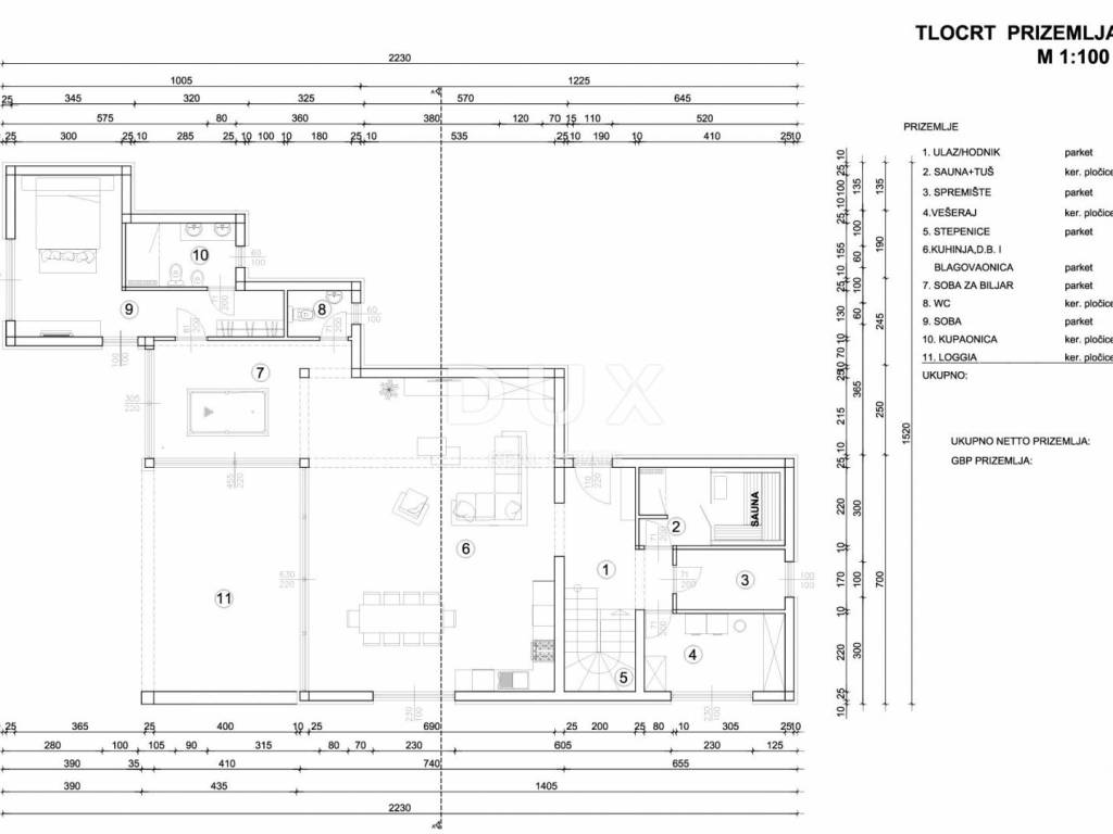 Ground floor: entrance hall, sauna with shower, storage room, laundry room, open living area with kitchen and dining room of 60 m2, game room, toilet, bedroom with bathroom, loggia of 28 m2