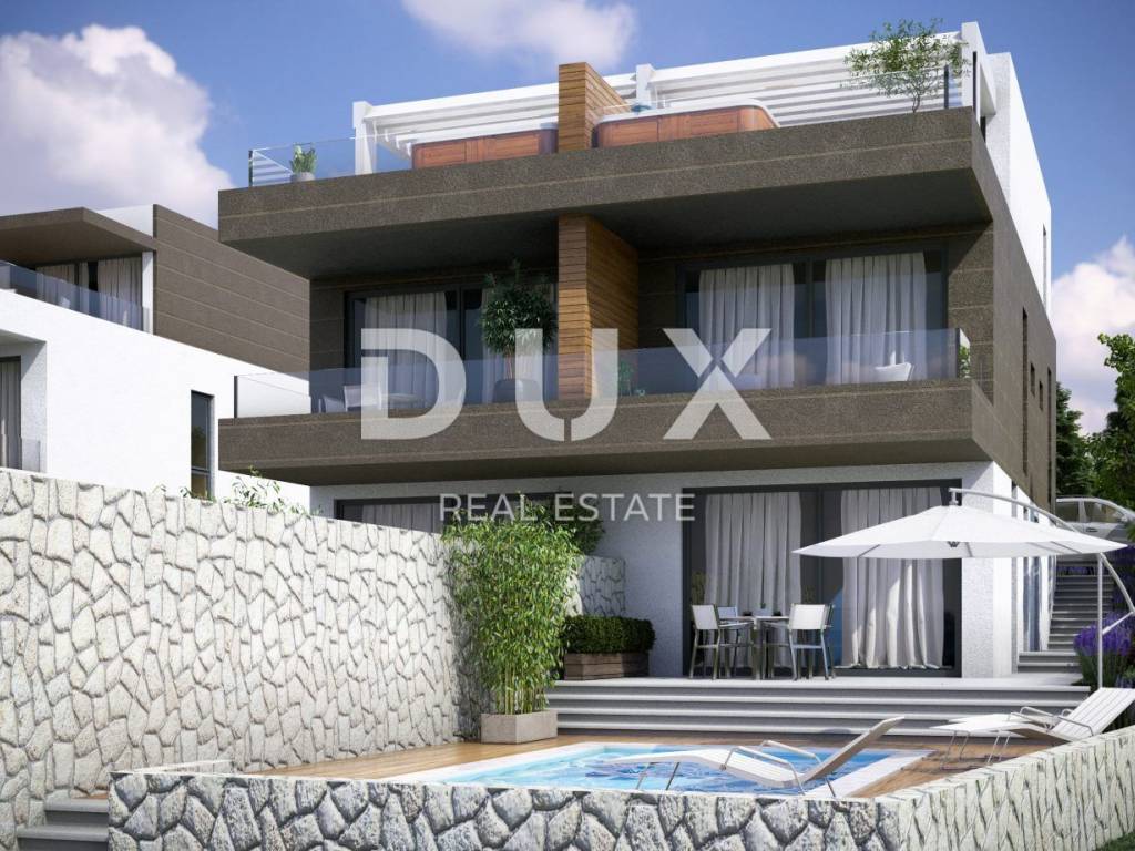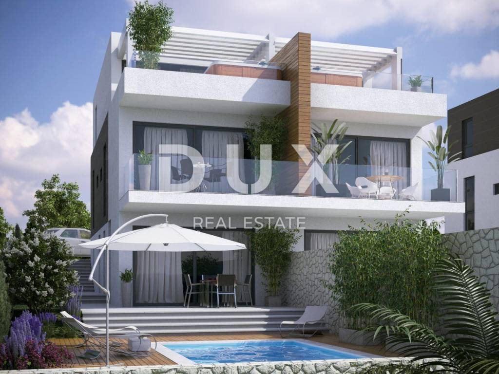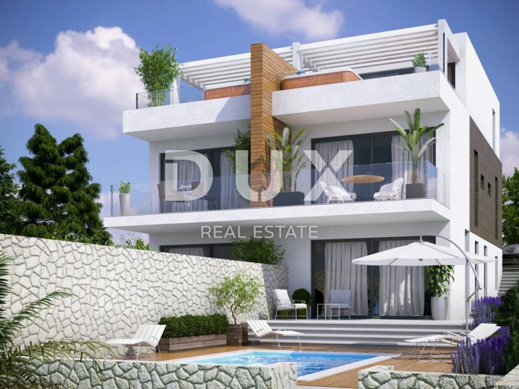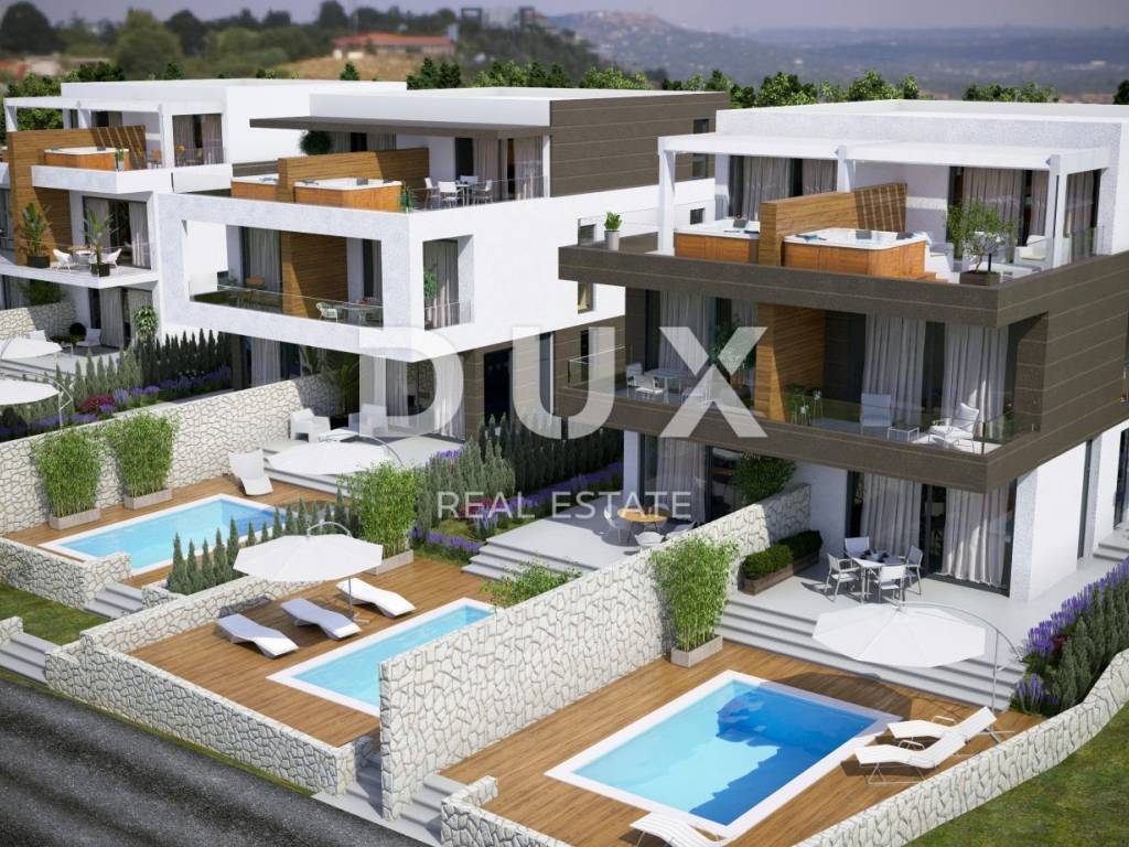 On the island of Pag in Novalja, just 200 meters from the sea, there are three urban villas with 4 residential units in each. The two-bedroom apartments on the ground floor of 62 and 69 m2 have a garden, a swimming pool and one parking space, while the two-storey apartments are located on the first floor and have a jacuzzi on the roof terrace. Top-quality new buildings surrounded by greenery in a beautiful location near the city and the sea.