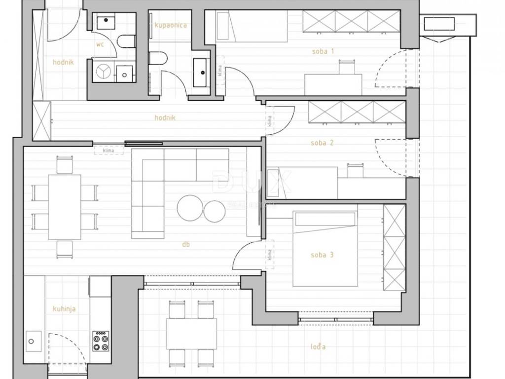 Attractive new building in an excellent location! Inside the building there are 40 apartments and 4 business premises distributed over 5 above-ground floors. Parking and storage rooms for tenants are located within 2 floors of the underground garage, which reduces the visual impact of the parking lot and allows for as many walkable green areas on the ground floor as possible. The apartments meet the highest construction criteria, and their design follows a modern and luxurious interior design. Each apartment has a spacious loggia to allow outdoor living throughout most of the year. The building is rectangular in shape, consisting of two underground and five above-ground floors. The garage space is located in the underground floors on two floors, with a total of 75 parking spaces with an average width of 2.70 meters and storage rooms for residential spaces. The ground floor houses 4 business premises and 2 residential units. The floors from the 1st to the 4th floor are for residential purposes. The orientation of all apartments is west-south-east, which offers a view of the Kvarner Bay, the island of Krk and Opatija. All floors are connected by a three-flight staircase and two large elevators for 9 people each. LOCATION The luxurious apartment building Premium Living Rijeka is located between Opatija and Rijeka on Zamet. The building is located 600 meters as the crow flies from the sea. The location of the building is close to all amenities, yet far enough from the city bustle. The building is located outside the city center of Rijeka, on Zamet. The proximity of various amenities for living and recreation is one of the prominent advantages of these apartments. A sports hall, playground, market, primary school, kindergarten, shop, doctor's office, beach, outdoor tennis courts, all of this is located in the immediate vicinity of the building. Thanks to the busy location of the building and the proximity of the bypass, you will be in the city center or the City of Opatija in just fifteen minutes by car. EQUIPMENT: The apartments are equipped with DAIKIN systems for heating and cooling the living room, kitchen and bedrooms in each apartment separately. Primary heating of residential areas is via a DAIKIN ALTTHERMA hybrid heat pump and underfloor heating. The pump uses electricity or city gas as an energy source, depending on the parameters of external conditions and energy prices. Hot water is prepared via the same system. The floors of the interfloor structures will be made of high-quality ceramic tiles/parquet of the 1st class. Underfloor heating will be installed inside the apartments. The ceilings will be made of a sub-view of load-bearing reinforced concrete panels. Facade - The central part of the building will be constructed as an ETICS facade, with 10 cm thick mineral wool, while the side "outlines" are constructed as a ventilated facade of composite panels. Windows and glazed doors will be made of aluminum frames with an interrupted thermal bridge, manufactured by WICONA and double thermal insulation glazing filled with gas. Sliding shutters are provided for sun protection in the central part of the building, and partially roller shutters on other facade openings. The roof is flat and impassable, with access for maintenance. The load-bearing structure is robust, monolithic reinforced concrete, extremely resistant to high levels of earthquakes. The compressive strength of the concrete of the Premium living building is grade 45, which ensures resistance to even the strongest recorded natural disasters in the Rijeka area and beyond. The buyer is exempt from paying real estate tax. ENERGY CLASS A+, which means a building with significantly lower energy costs. START OF CONSTRUCTION; 05/2023. COMPLETION OF CONSTRUCTION and MOVE-IN 4/2025.