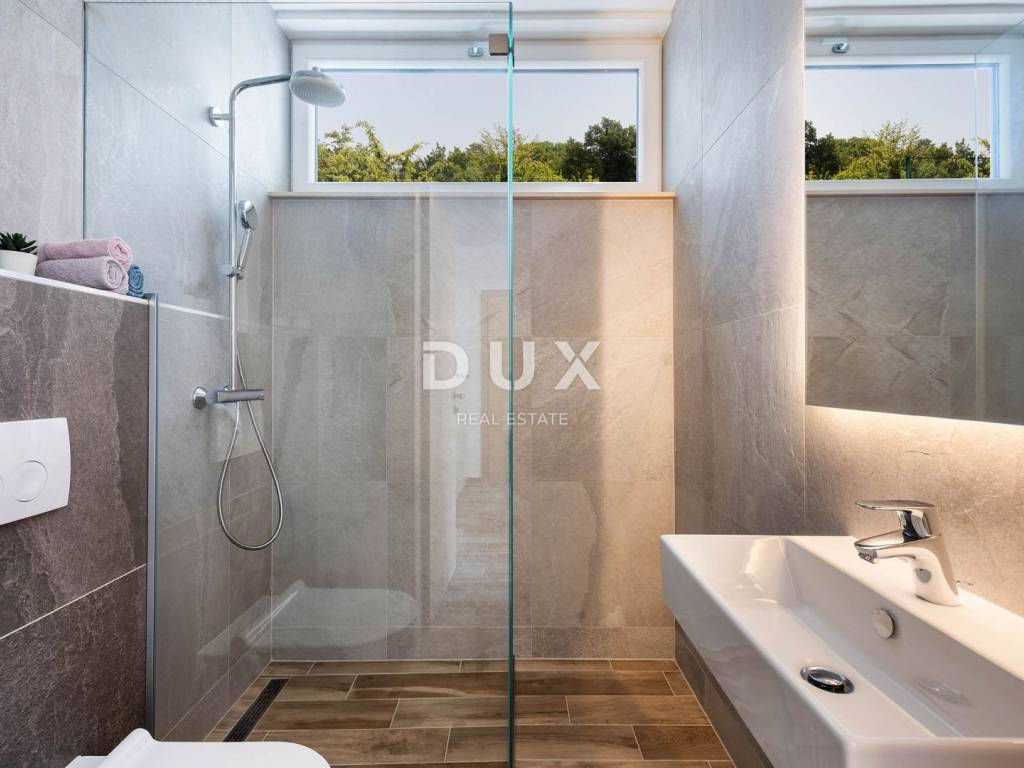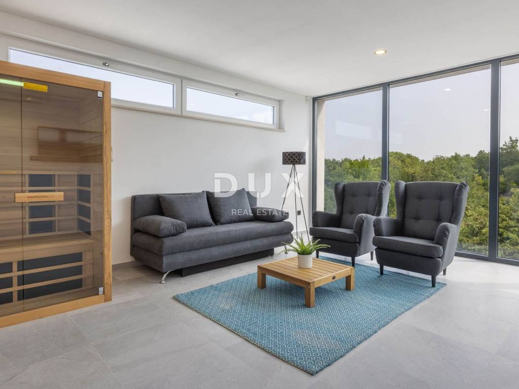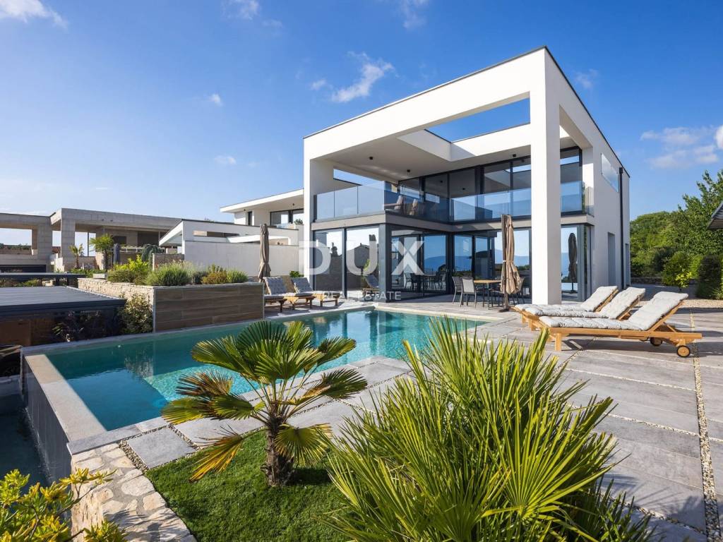 We present you an exceptional opportunity - a modern and luxurious villa in one of the most desirable locations on the island of Krk, offering spectacular sea views and the perfect combination of privacy, elegance and comfort. Located in a quiet, well-maintained residential area, this architecturally impeccable villa is located on a 518 m plot and exudes sophistication, top-notch design and impeccable functionality. It is ideal for both luxurious family life and as a top investment in elite tourism. The carefully landscaped garden features a large infinity pool, a spacious sundeck, a covered terrace with an outdoor dining area and a summer kitchen with a barbecue. On the ground floor, you will find a spacious open-space living area with panoramic glass walls that open up views of the pool and the sea, a modern kitchen with an island and a dining room. On the same floor there are two comfortable bedrooms, each with its own bathroom and private terrace. The villa's first floor brings an extra dose of luxury: a living room/work area with a sofa bed and a balcony overlooking the forest, a master bedroom with a bathtub, a luxurious bathroom and a modern Scandinavian sauna, a spacious balcony with a stunning sea view and a spacious walk-in closet. The villa is built to the highest standards and equipped with state-of-the-art technology: underfloor heating via a heat pump, air conditioning in all rooms, top-quality aluminum joinery, sophisticated lighting and a heated pool. The southern orientation ensures plenty of natural light throughout the day, while the panoramic views of the Kvarner Bay and the surrounding islands are simply breathtaking. There is covered parking for up to three vehicles. It is only 2,500 meters from the sea - a five-minute drive or a pleasant thirty-minute walk. The future owner can be provided with a boat mooring in the nearby harbor. Rijeka Airport is only 27 km away (about a 20-minute drive). This villa is not just a home - it is a lifestyle. The combination of superior comfort, modern design and unique location makes it a rare opportunity on the market. Dear potential buyers, We are glad that you are interested in the properties from our offer. For more information and an agreement regarding a viewing of the property, please feel free to contact us. Consultations are possible in German.