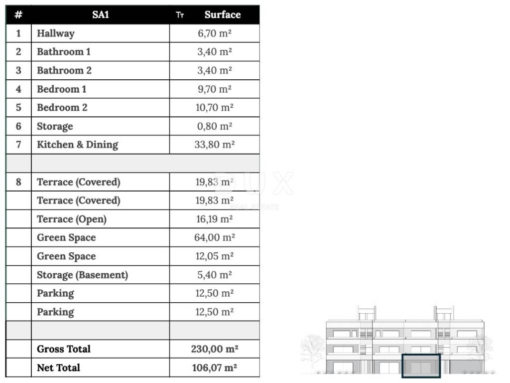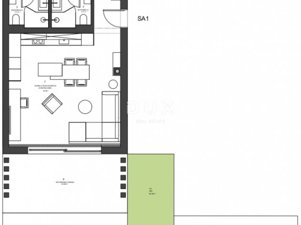 Just 95 meters from the sea, in the quiet town of Zaton, a modern project is being built with nine luxury apartments located in a closed resort with a ramp at the entrance. The settlement is designed as a private oasis, consisting of five buildings, where residents enjoy complete security and privacy. Apartments on the upper floors have spacious roof terraces with beautiful views of the sea and islands, while ground floor units have their own gardens. Each residential unit comes with two outdoor parking spaces, and there is also the option of purchasing fully furnished apartments for an additional fee. Special attention has been paid to interior design, modern technological solutions and quality materials to make the home functional, safe and comfortable. The smart home system allows for the control of lighting, air conditioning and heating, and the construction is carried out with a reinforced concrete structure with 10 cm of thermal insulation. Aluminum joinery with electric shutters, multi-split air conditioners, underfloor heating in the bathrooms and living room, video intercom, surveillance cameras and burglar and fire doors are part of the standard equipment. First-class sanitary ware and floor coverings from renowned manufacturers were used. The planned completion of the works is by the end of 2025. Apartment SA1 is located on the ground floor and consists of two bedrooms, two bathrooms, a storage room and a spacious living area with a kitchen and dining room. Its special value is made up of a large garden, a covered terrace and two additional uncovered terraces. Zaton is a quiet Dalmatian town known for its crystal clear sea, pebble beaches and relaxed Mediterranean atmosphere, while Zadar is nearby - a city rich in history, cultural attractions and top-notch restaurants, an ideal destination for living and vacation. The seller is a legal entity and the buyer does not pay real estate tax. For all additional information and to arrange a viewing, please feel free to contact us.