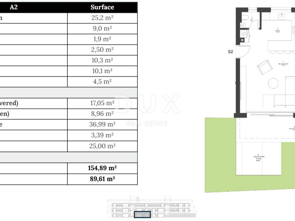 In the quiet and charming town of Zaton, just 45 meters from the beach, there is a new modern building with two entrances and two elevators that hides ten exclusive apartments. Each one has been carefully designed to provide maximum comfort and enjoyment - the ground floor apartments are enriched with private gardens, the apartments on the middle floors have spacious terraces, while the penthouses offer rooftop oases with installations for summer kitchens and jacuzzis, ideal for relaxed evening gatherings at sunset. All apartments are equipped with air conditioning in every room, while the penthouses additionally have underfloor heating throughout the interior. Apartment A2 with a net area of 89.61 m2 combines functionality and elegance. The layout includes two bedrooms, a bathroom, an additional toilet, a kitchen and a spacious living room. What sets it apart are the two terraces - one covered and one open - that perfectly connect the indoor and outdoor spaces. The apartment also comes with two parking spaces and a storage room, and the equipment includes electric shutters, security doors and a video intercom. Buyers also have the option of taking over the fully furnished interior, which allows them to move in without additional worries. A special benefit the buyer is exempt from paying real estate tax because the seller is a legal entity. Zaton is known for its long pebble beaches, crystal clear sea and peaceful atmosphere that combines the traditional Dalmatian atmosphere with modern amenities. In the immediate vicinity there is a resort with numerous amenities restaurants, cafes, sports fields and wellness programs, which makes this place ideal for both vacation and life throughout the year. Just a ten-minute drive away is Zadar, a city rich in history and culture, world-famous for its Roman forums, Romanesque churches, the Sea Organ and the Greeting to the Sun. If you are looking for a combination of luxury, comfort and a Mediterranean lifestyle, contact us for more information and to arrange a tour.