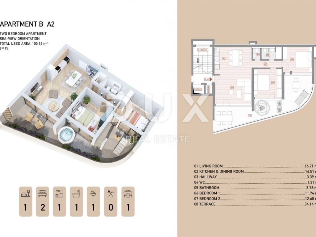 We present to you a luxurious residential complex located in one of the most desirable parts of Opatija, just a few minutes' walk from the sea, the city center and all key amenities. This exclusive project consists of two modernly designed buildings, perfectly integrated into the Mediterranean landscape, and each building will contain six apartments of various sizes (from 48 m to 240 m). Of particular value are the penthouse apartments with panoramic views, as well as ground floor apartments with private terraces and gardens. Each unit offers an unobstructed view of the Kvarner Bay. The complex will be surrounded by landscaped green areas, and residents will have access to a private underground garage with an elevator leading directly to the apartments, ensuring maximum comfort and security. LOCATION Located in a quiet area, yet close to everything - beaches, promenades, restaurants, shops and cultural attractions - this project offers the perfect combination of luxury, nature and urban life. Historical parks, a tennis club and famous wellness oases are just a few minutes' walk away. EQUIPMENT AND MATERIALS All apartments will be equipped in accordance with the highest standards of modern luxury: Oak two-layer parquet of top Austrian production Ceramics of the renowned Italian brand Atlas Concorde Grohe sanitary ware a combination of the Essence and Cubeo lines Underfloor heating and air conditioning with a Daikin heat pump High-security anti-burglary entrance door Apartment B - A2 Located on the first floor and covering an area of 100.16 m. This modernly designed two-bedroom apartment is oriented towards the sea and consists of a living room (16.71 m), kitchen and dining room (16.51 m), two bedrooms, bathroom, toilet and hallway. A special value is given by a spacious terrace of as much as 34.14 m with space for relaxing and enjoying the view. OPATIJA: A beautiful coastal town located on the Adriatic Sea is a famous tourist destination for tourists from all over the world. The city is surrounded by beautiful nature, at the foot of Mount Učka. Real estate in Opatija offers priceless views of the sea and the surrounding islands of Krk and Cres. Opatija is surrounded by charming small towns with old houses located in narrow streets rich in history. The streets of the city of Opatija are made up of properties that stand out with their specific architecture and villas dating back to the Habsburg period. A wide selection of beaches, crystal clear sea and a variety of tourist services are key factors that make Opatija a perfect tourist destination recognized by neighboring countries as an excellent investment choice.